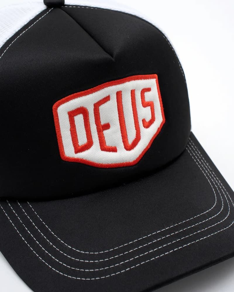 Gorra trucker Deus negra con panel frontal acolchado, parche bordado y malla blanca. Cierre snapback y diseño atemporal con aire motero.