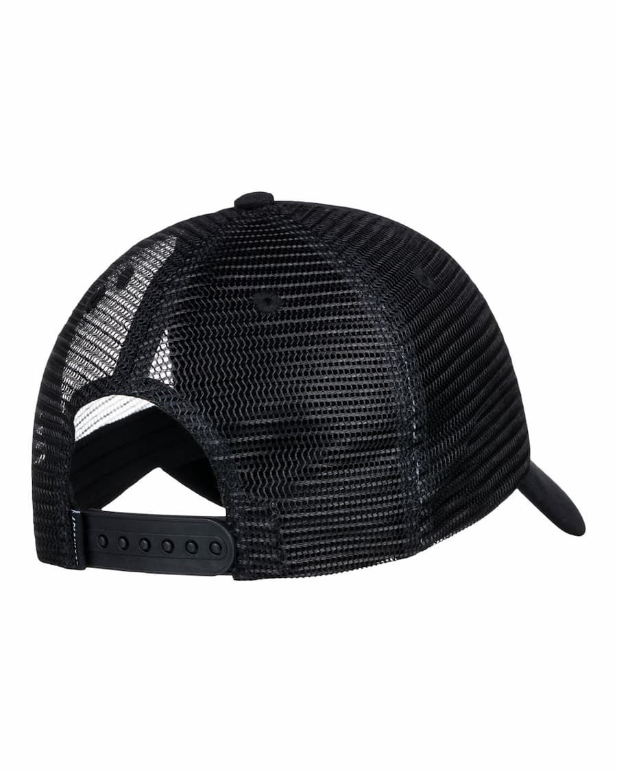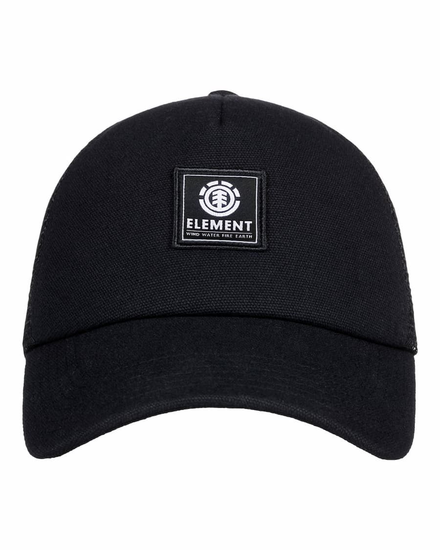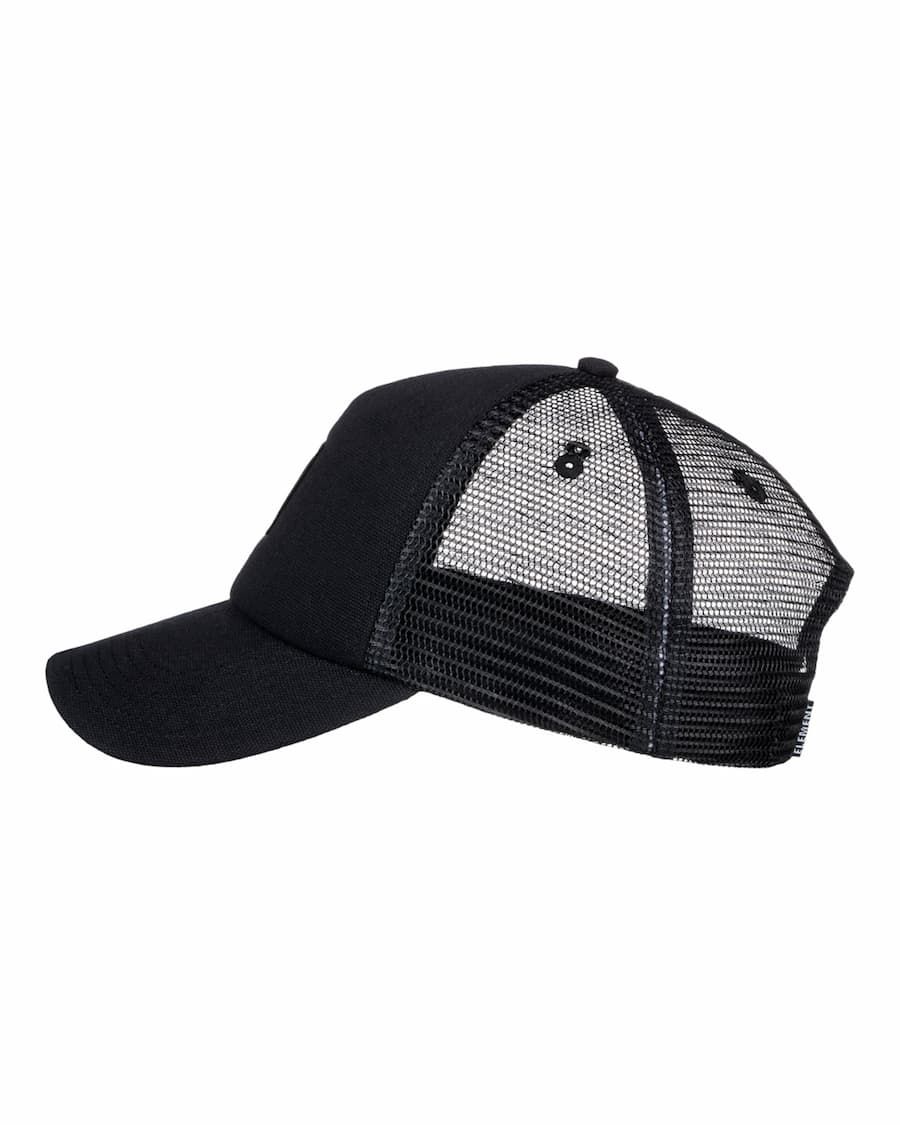Esta clásica gorra de estilo camionero cuenta con lona de algodón acolchada negra, malla de poliéster en color negro para mayor transpirabilidad, construcción en 6 paneles, visera curvada, corte reducido, cierre posterior ajustable de plástico, un parche de tela con el logo de Element tejido en la parte delantera y una etiqueta de Element cosida en el cierre.