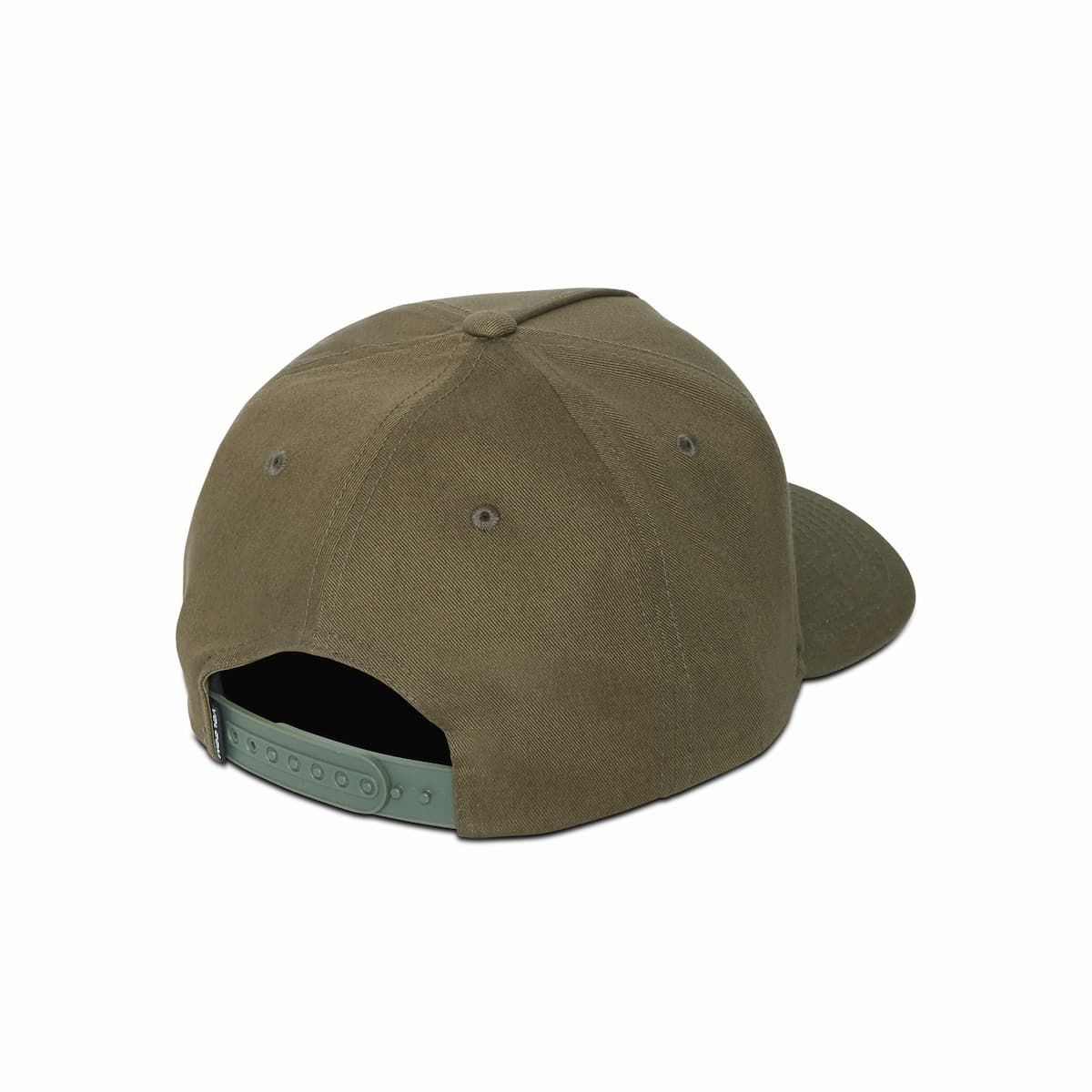 La gorra Embossed Stone verde para hombre tiene una etiqueta de garantía Volcom tejida en el cierre.