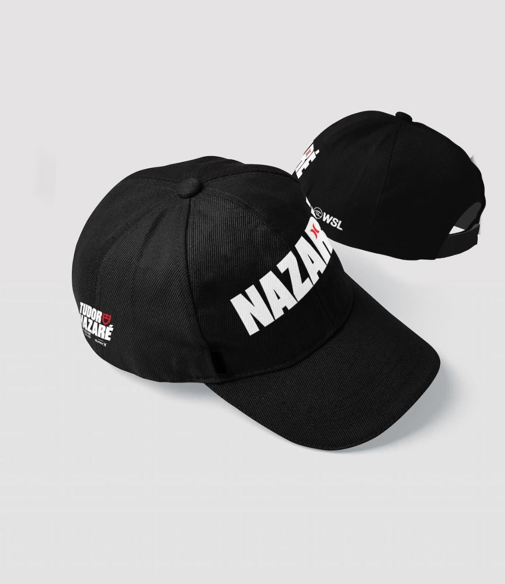 La gorra Tudor Nazaré negra cuenta con ajuste regular, visera ligeramente curvada, cierre posterior ajustable a presión, impresión WSL en el lateral izquierdo, impresión Tudor Nazaré Tow Surfing Challege x Hurley en el lateral derecho y el logo de Nazaré y Hurley estampados en el frontal.