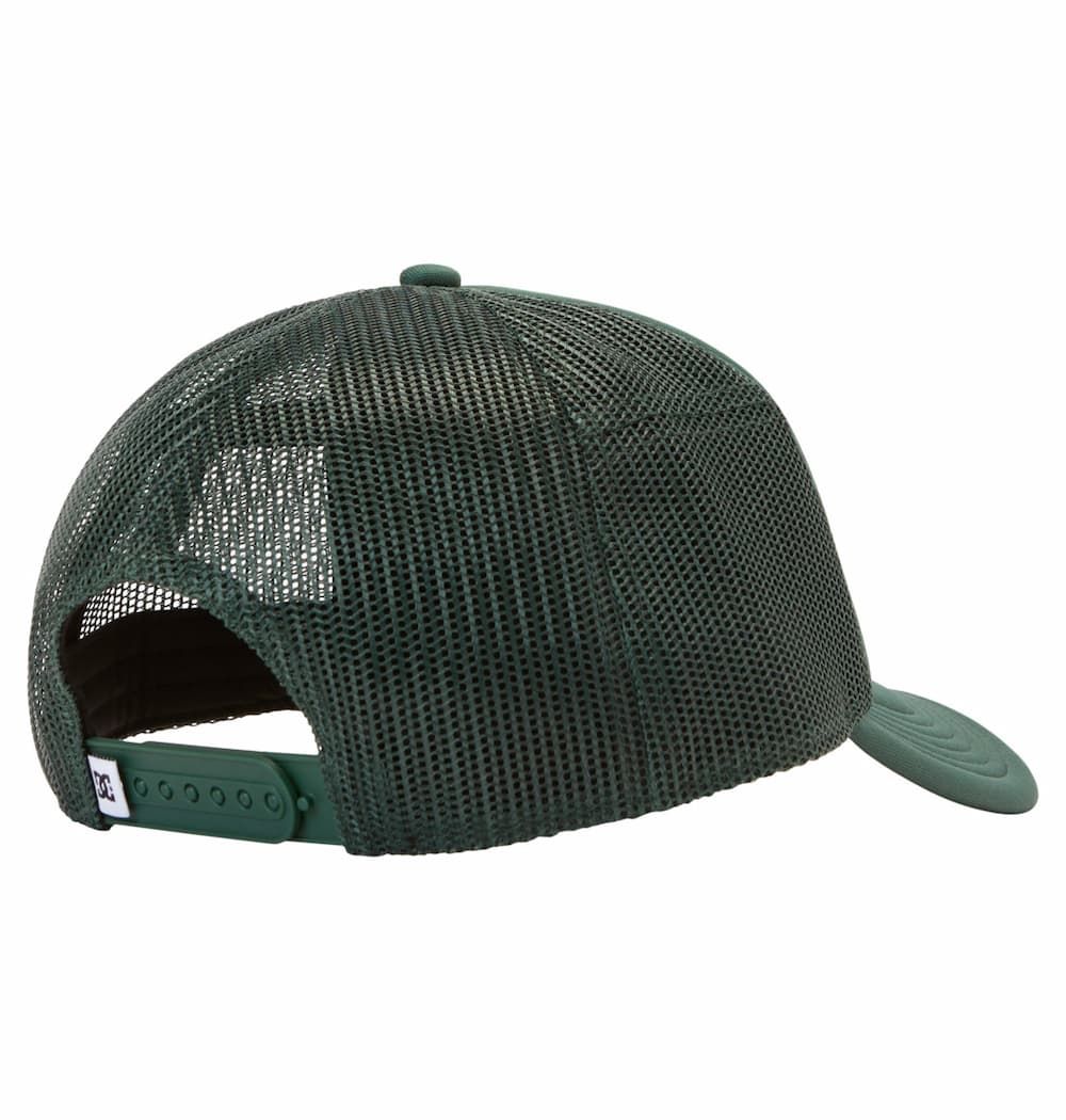 La gorra trucker DC 321 Verde para hombre tiene una etiqueta de garantía DC Shoes tejida en el cierre.