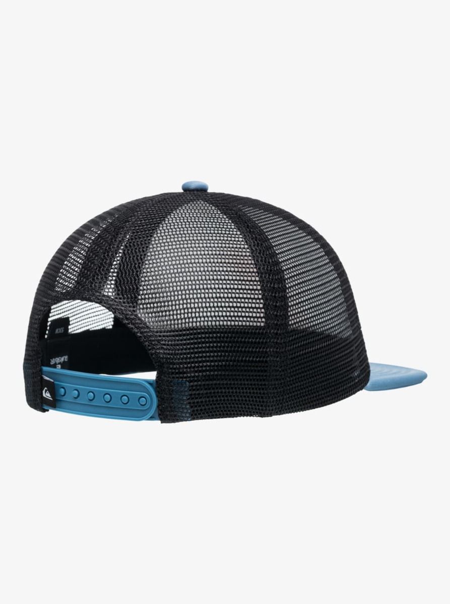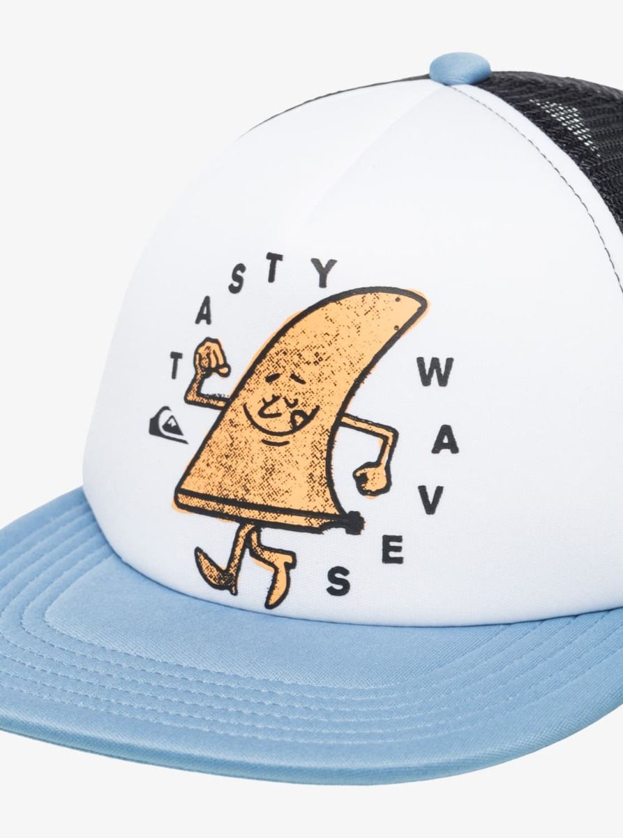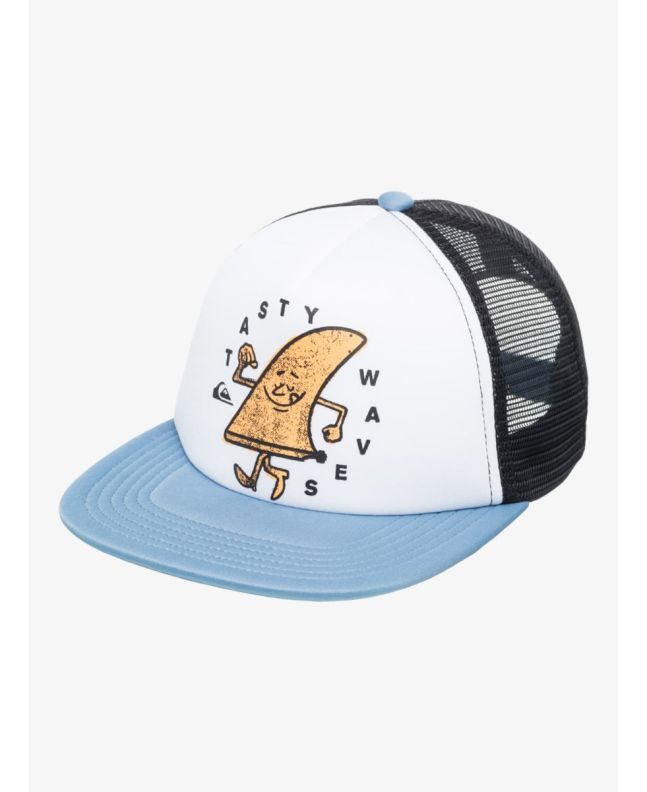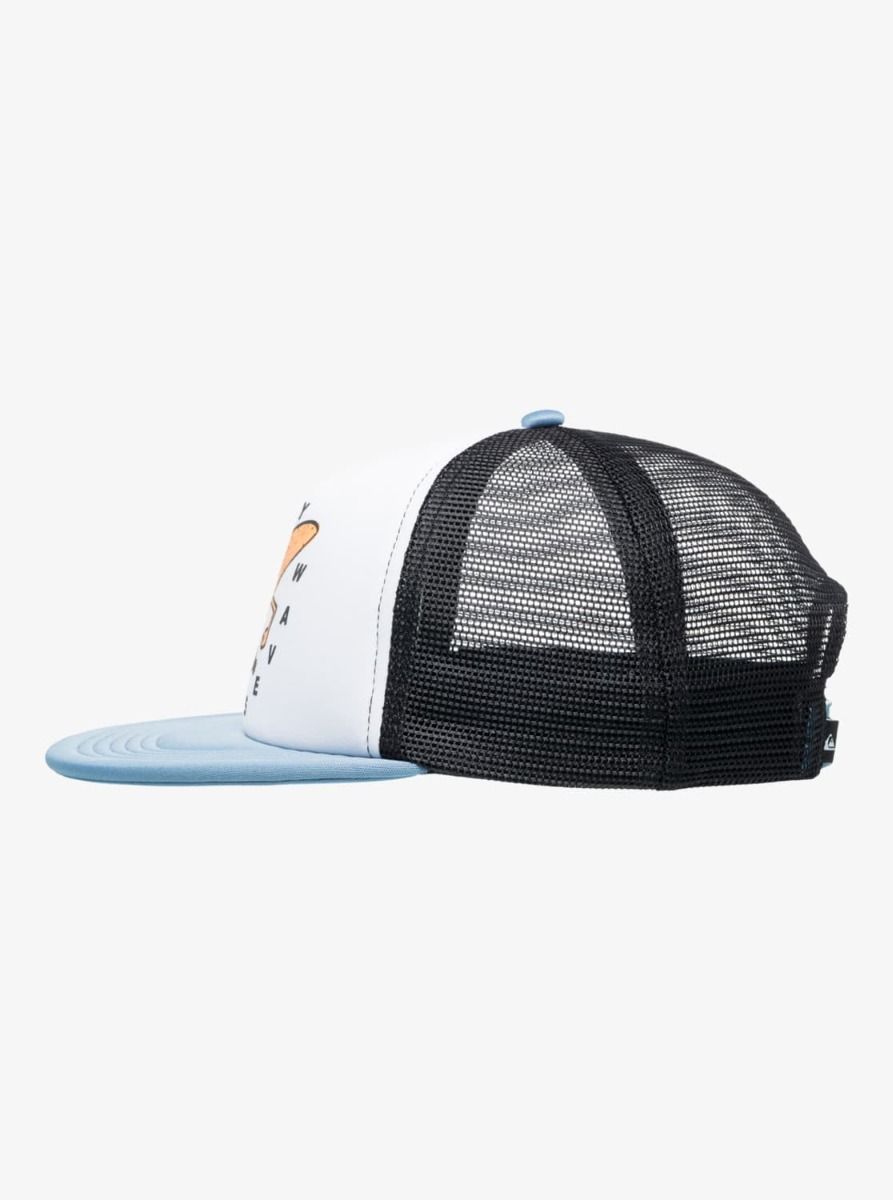 Gorra trucker para niño con visera plana, malla trasera y divertido gráfico Quiksilver. Comodidad y ventilación para el verano.