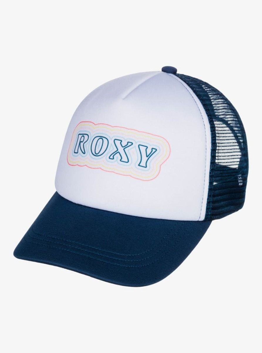 Esta gorra de estilo camionero en talla única cuenta con construcción en 6 paneles con forma de "J", visera curvada, cierre posterior ajustable a presión de plástico, rejilla trasera y serigrafiado ROXY en la parte frontal.