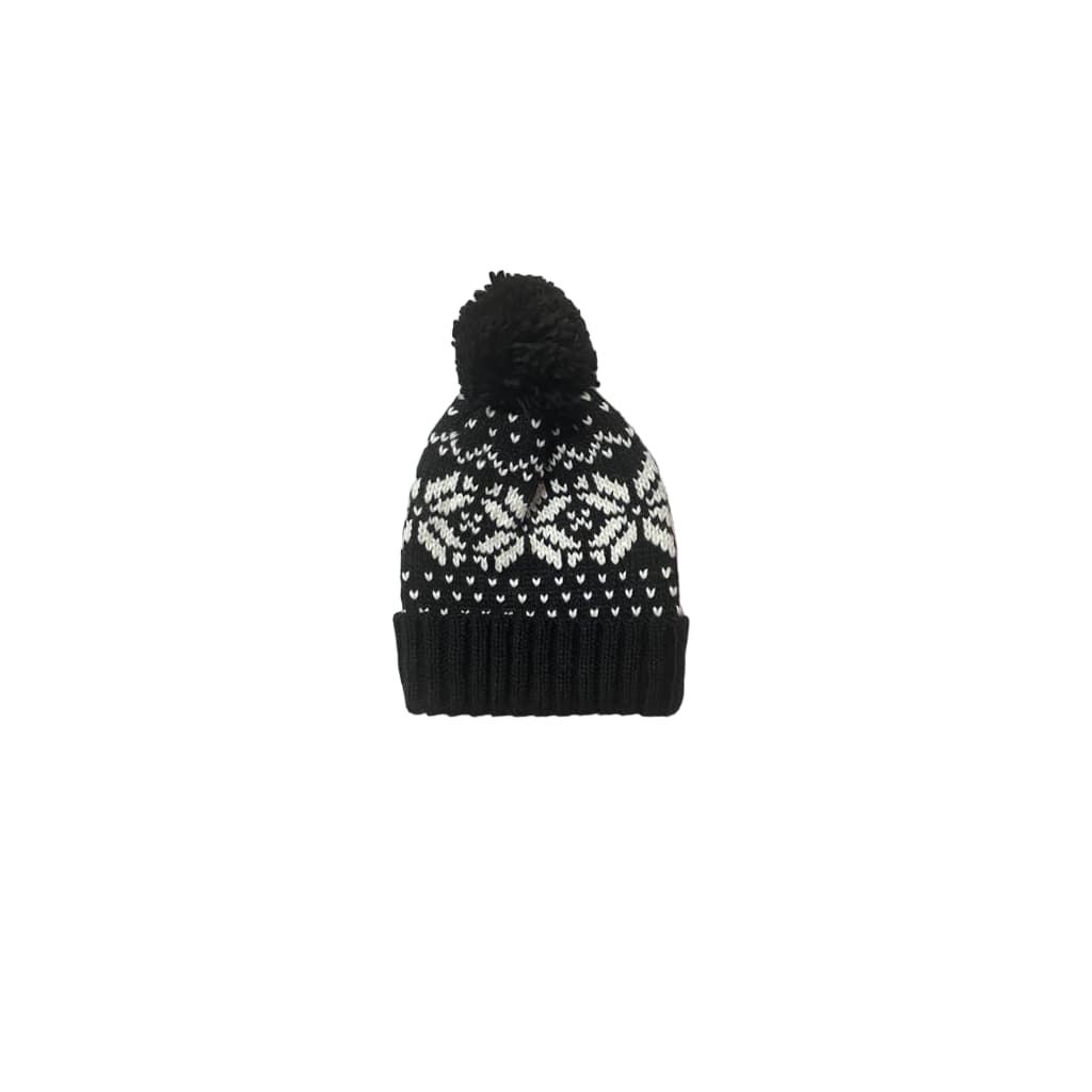 Este cálido beanie color negro cuenta con tejido de punto trenzado elástico, puño vuelto, un pompón en la parte superior, motivos invernales bordados en contraste y una discreta etiqueta de tela con la "M" de Mission tejida en el puño.