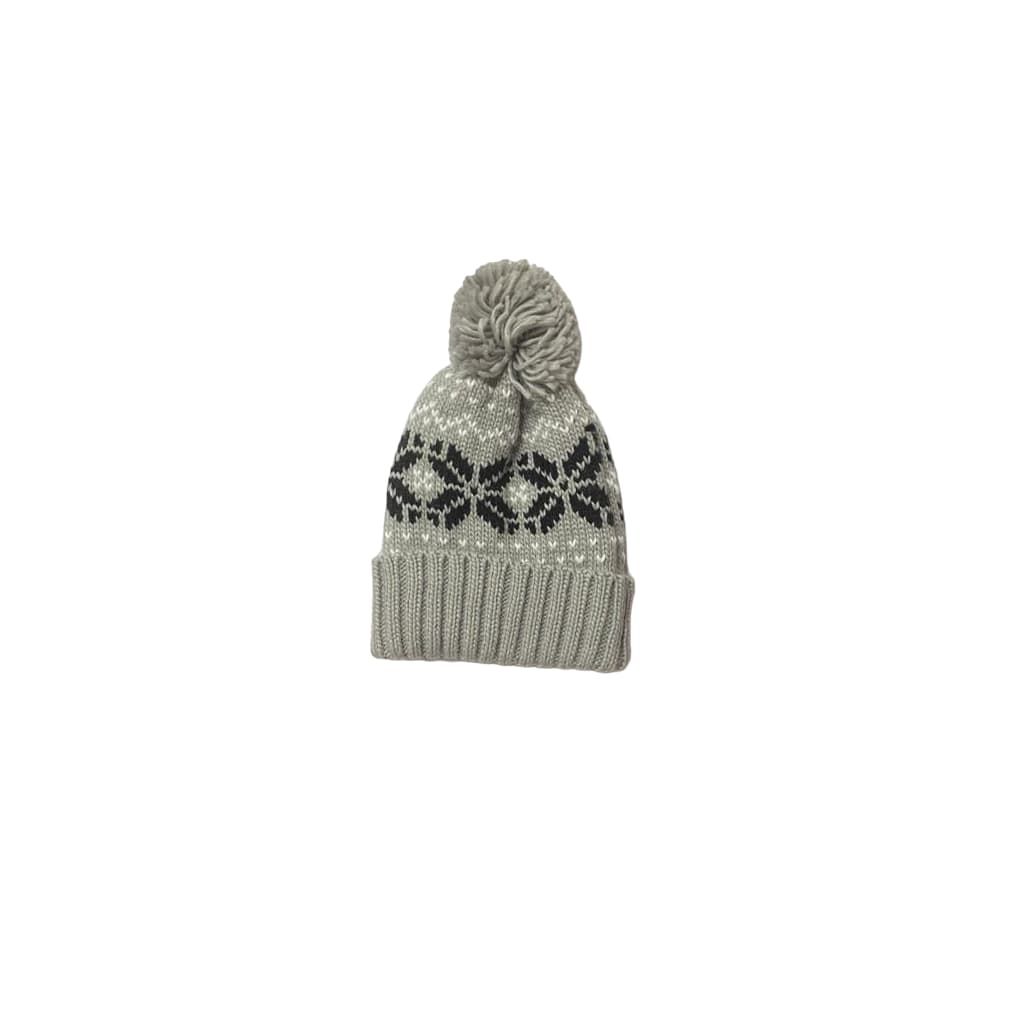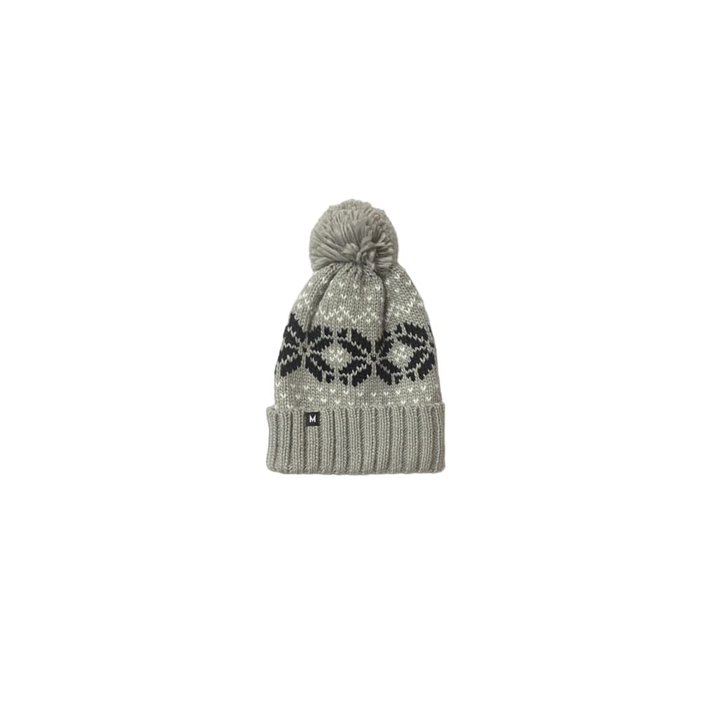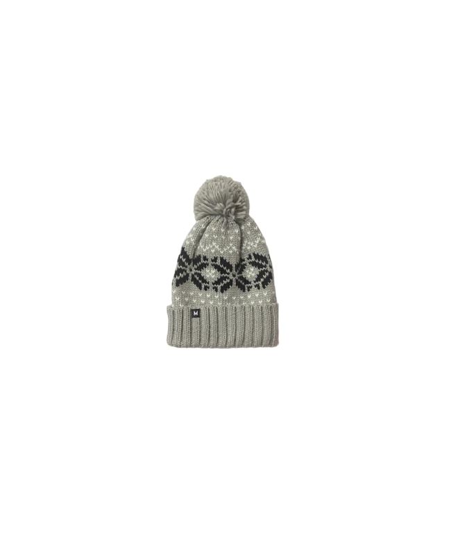 Este cálido beanie color gris cuenta con tejido de punto trenzado elástico, puño vuelto, un pompón en la parte superior, motivos invernales bordados en contraste y una discreta etiqueta de tela con la "M" de Mission tejida en el puño.