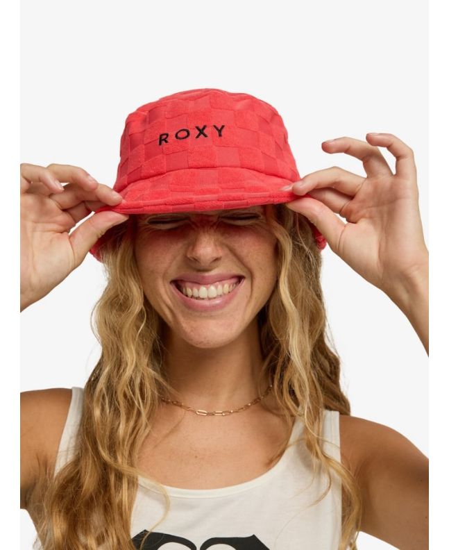 Gorro de pescador Roxy para mujer en color rojo Hibiscus, con tejido de rizo, bordado ROXY y ajuste cómodo para verano.