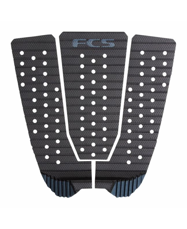 El grip para tablas de surf Kolohe Andino Treadlite Negro-Azul Oscuro 3 piezas tiene el logo de FCS estampado.