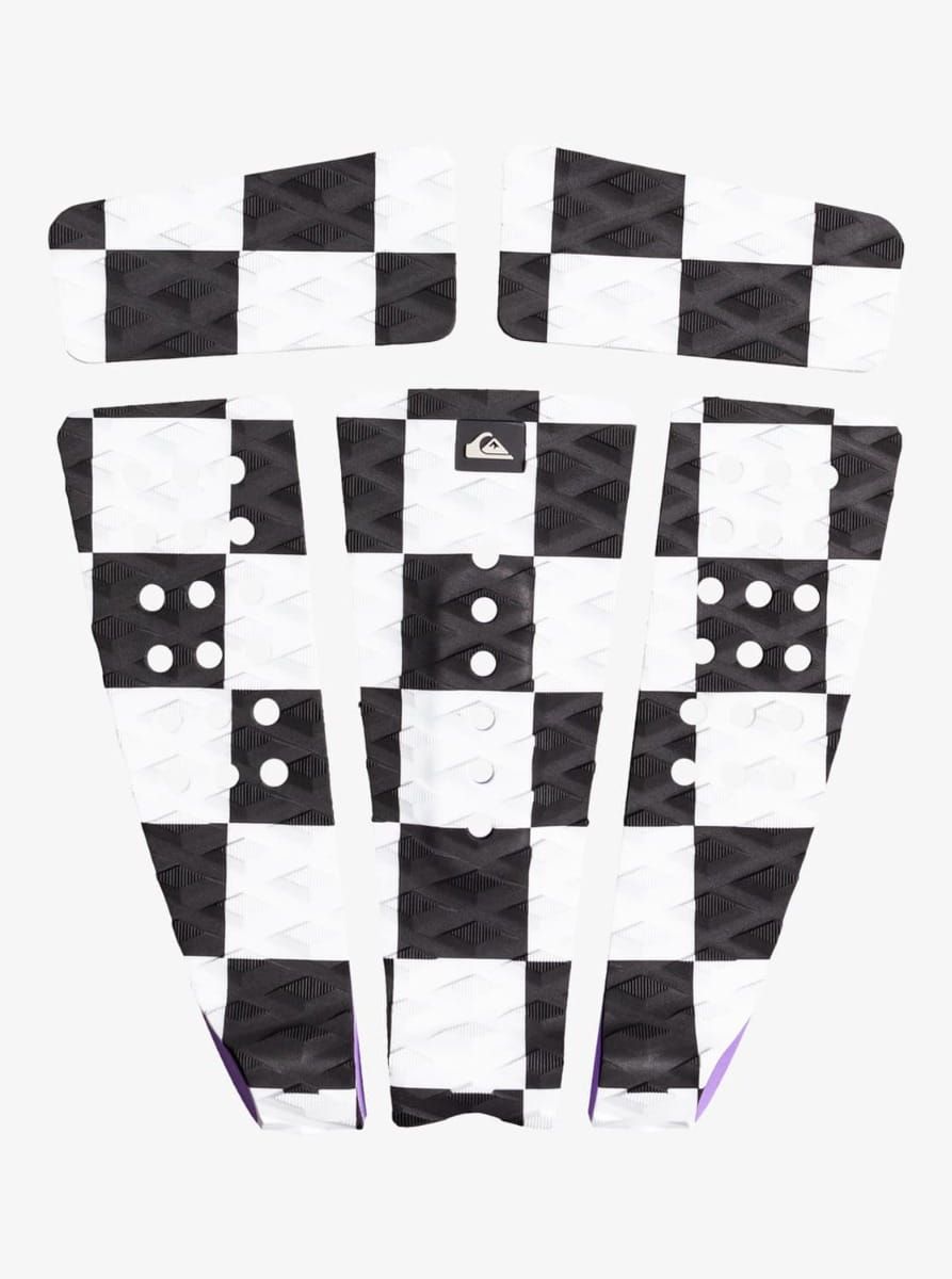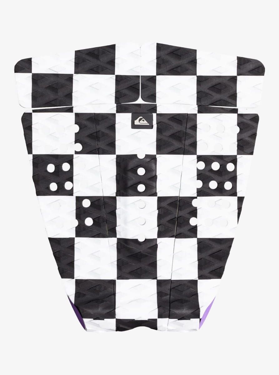 Este Tail Pad Quiksilver de 5 piezas cuenta con patrón de agarre de diamante, diseño a cuadros blancos y negros, perforaciones, arco central y adhesivo 3M.