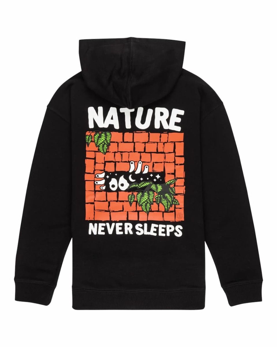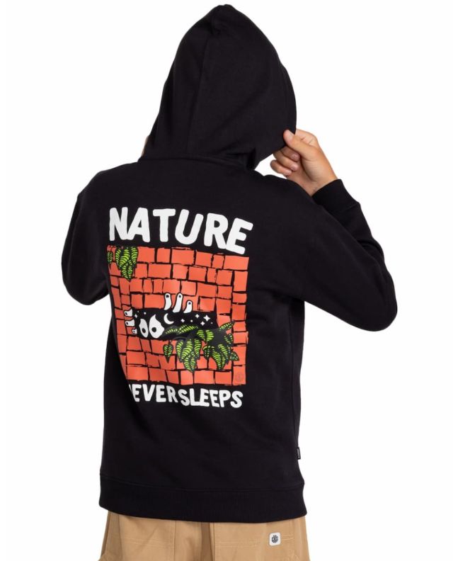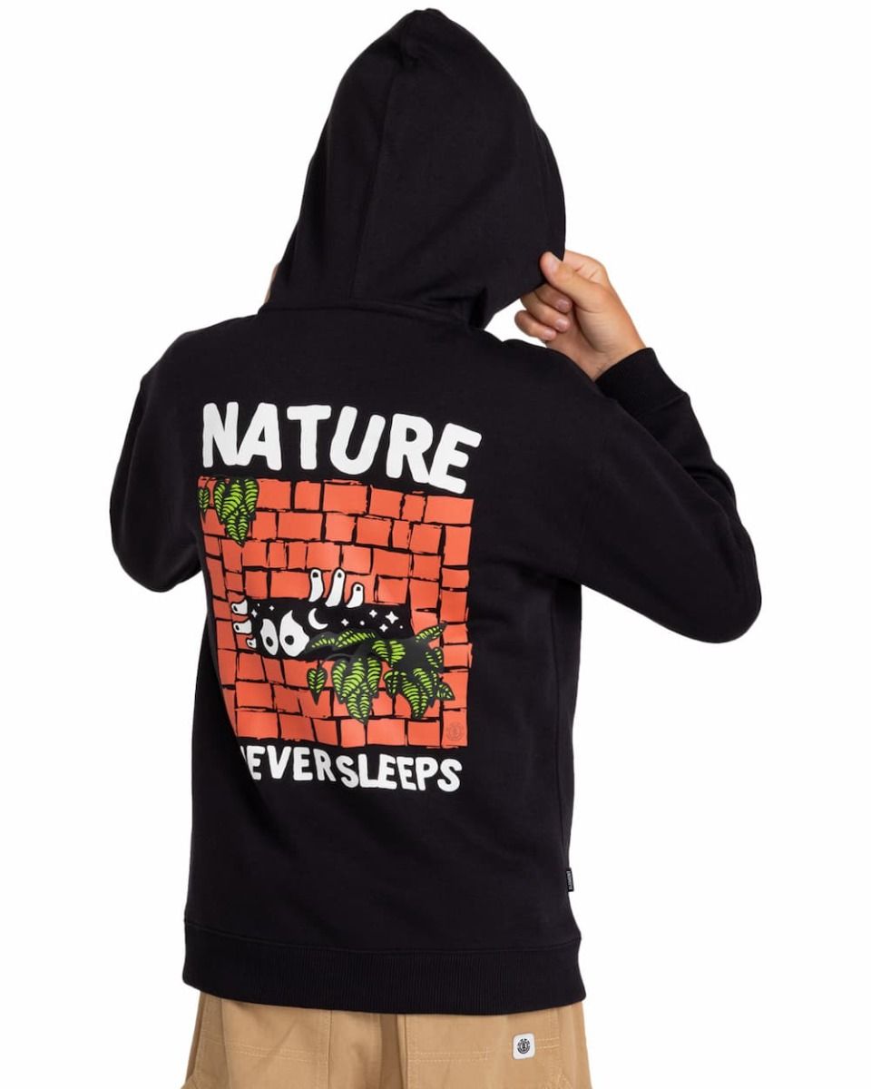 Este hoodie juvenil negro cuenta con diseño cerrado, corte normal, forro interior, punto canalé en puños y dobladillo inferior, capucha, bolsillo tipo canguro, serigrafiado Element Skateboard Co. en el lado izquierdo del pecho y un gráfico con la inscripción Nature Never Sleeps impreso en la espalda.