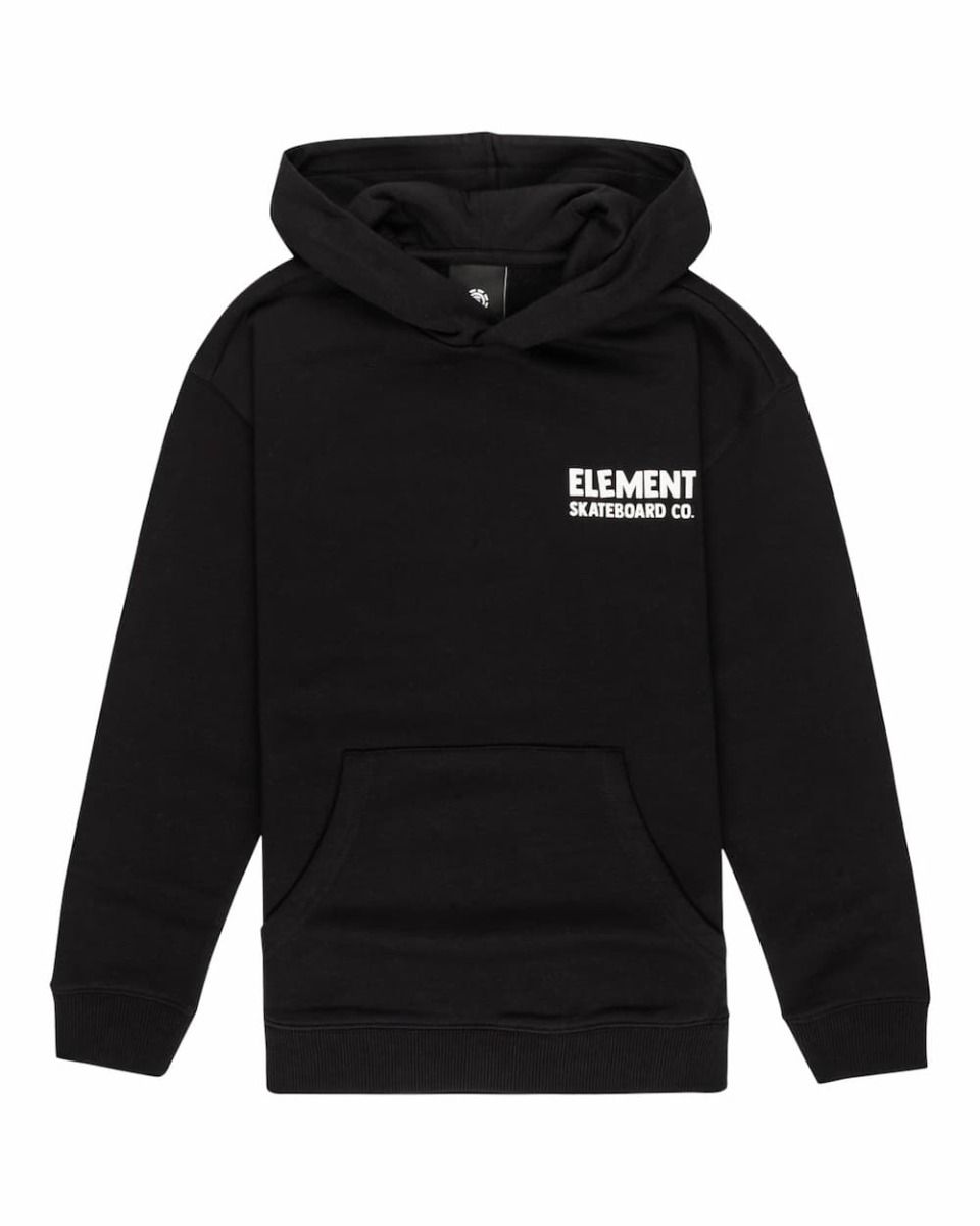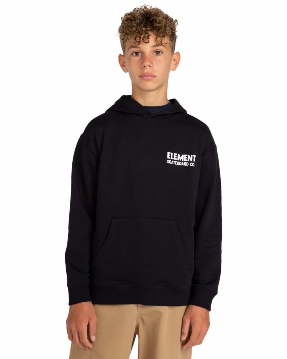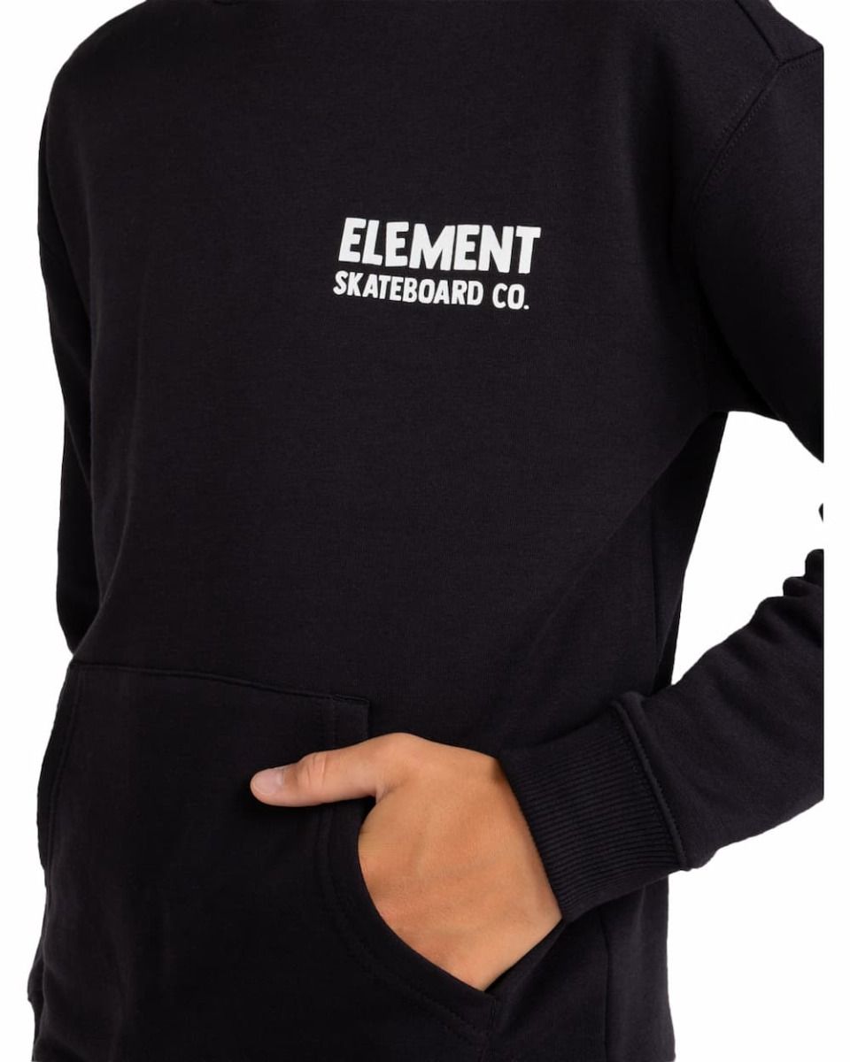 Este hoodie juvenil negro cuenta con diseño cerrado, corte normal, forro interior, punto canalé en puños y dobladillo inferior, capucha, bolsillo tipo canguro, serigrafiado Element Skateboard Co. en el lado izquierdo del pecho y un gráfico con la inscripción Nature Never Sleeps impreso en la espalda.