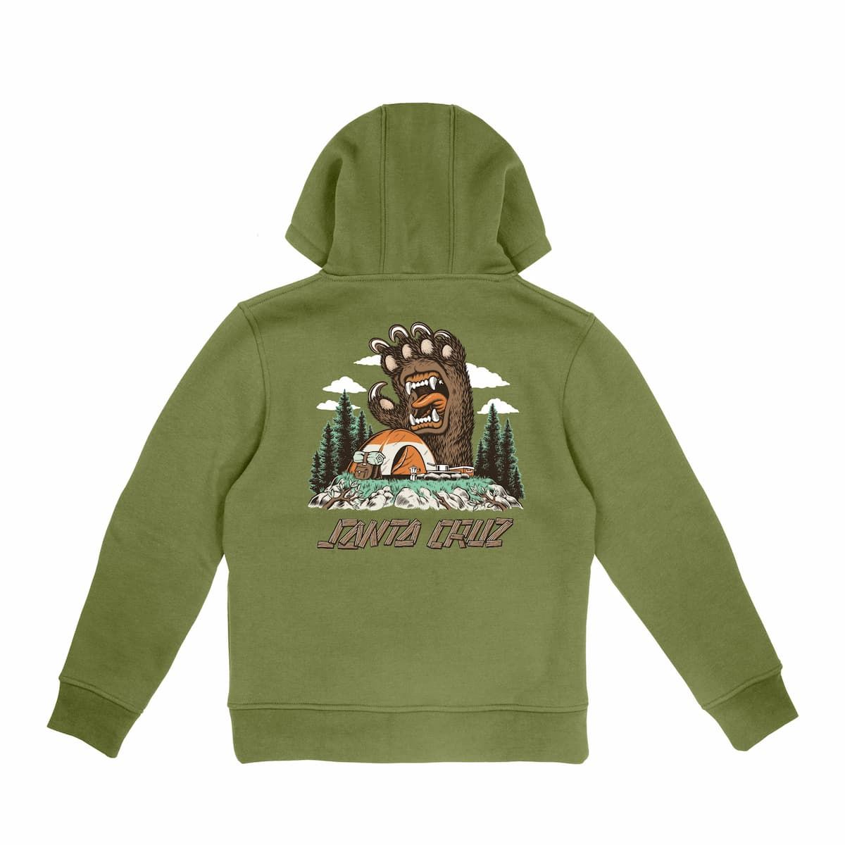 En la parte delantera, el logo Santa Cruz aparece de forma discreta y estilizada. En la espalda, un gráfico ilustrado de una mano rugiente con estética grizzly, acampando en medio del bosque, aporta toda la personalidad que caracteriza a la marca californiana. Una pieza con historia visual que conecta con el imaginario skater desde temprana edad.