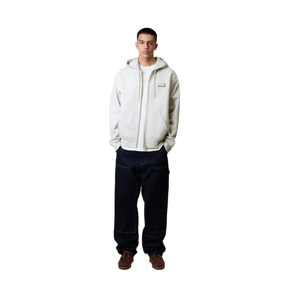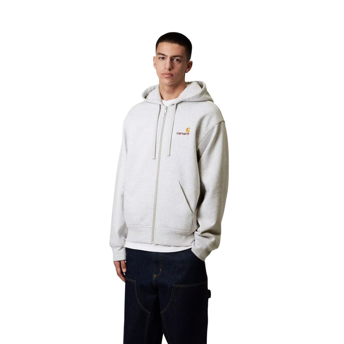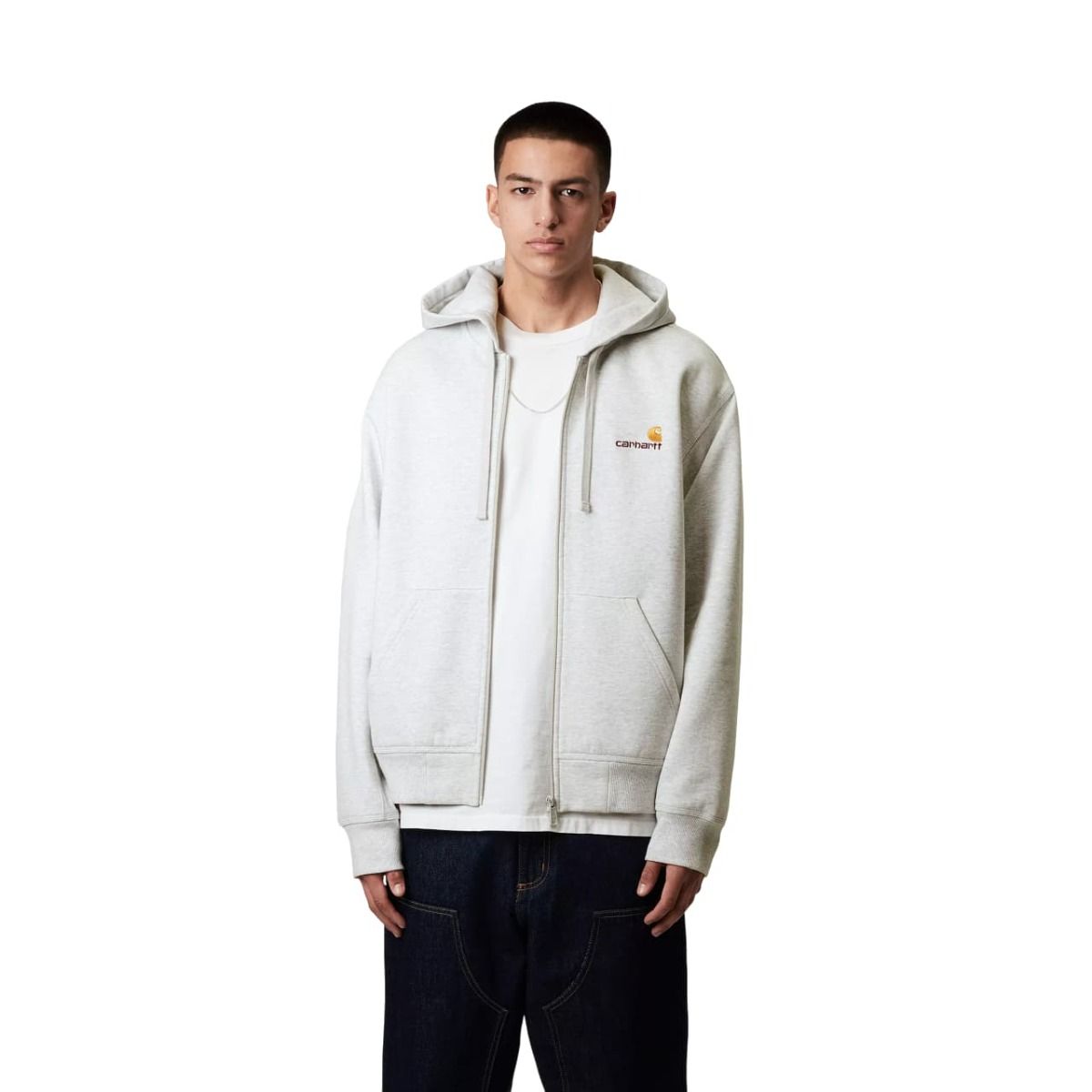 Esta sudadera gris con cremallera tipo chaqueta cuenta con corte holgado, puños y bajo acanalados para un efecto ceñido, tejido cepillado para un acabado suave similar al forro polar, capucha ajustable mediante cordón, bolsillo tipo canguro, junto con el logotipo Carhartt bordado en dos tonos en el lado izquierdo del pecho.