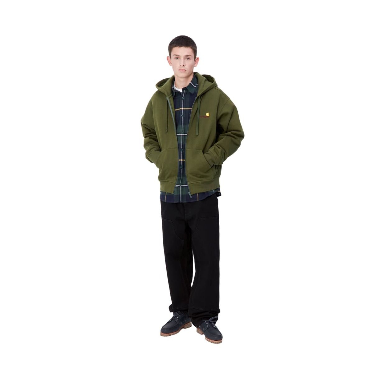 La chaqueta estilo sudadera para hombre Hooded American Script Jacket en tono verde estragón (Tarragon) de Carhartt WIP está confeccionada con tejido de punto grueso de 80% algodón y 20% poliéster (420g/sqm).