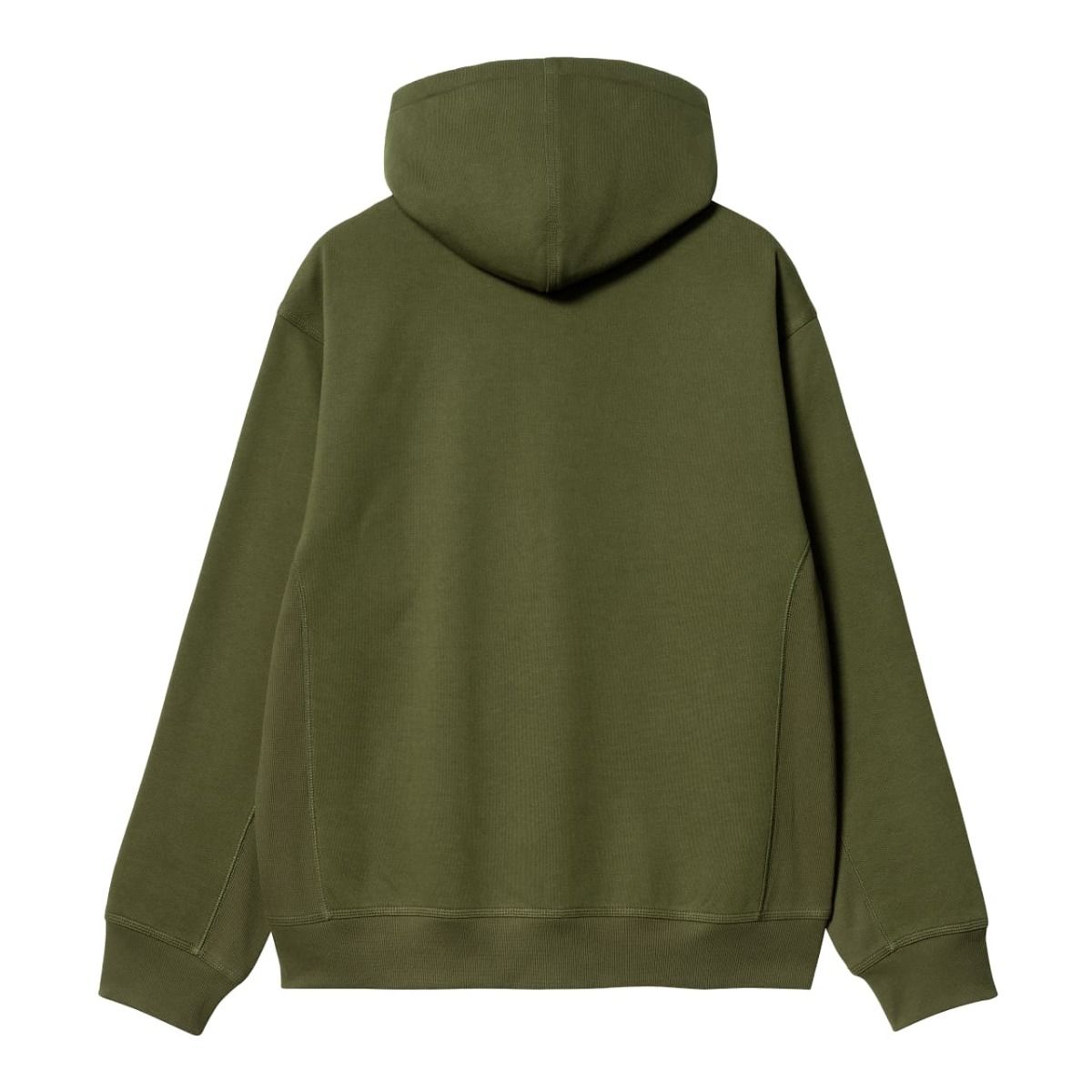 Esta sudadera verde con cremallera tipo chaqueta cuenta con corte holgado, puños y bajo acanalados para un efecto ceñido, tejido cepillado para un acabado suave similar al forro polar, capucha ajustable mediante cordón, bolsillo tipo canguro, junto con el logotipo Carhartt bordado en dos tonos en el lado izquierdo del pecho.