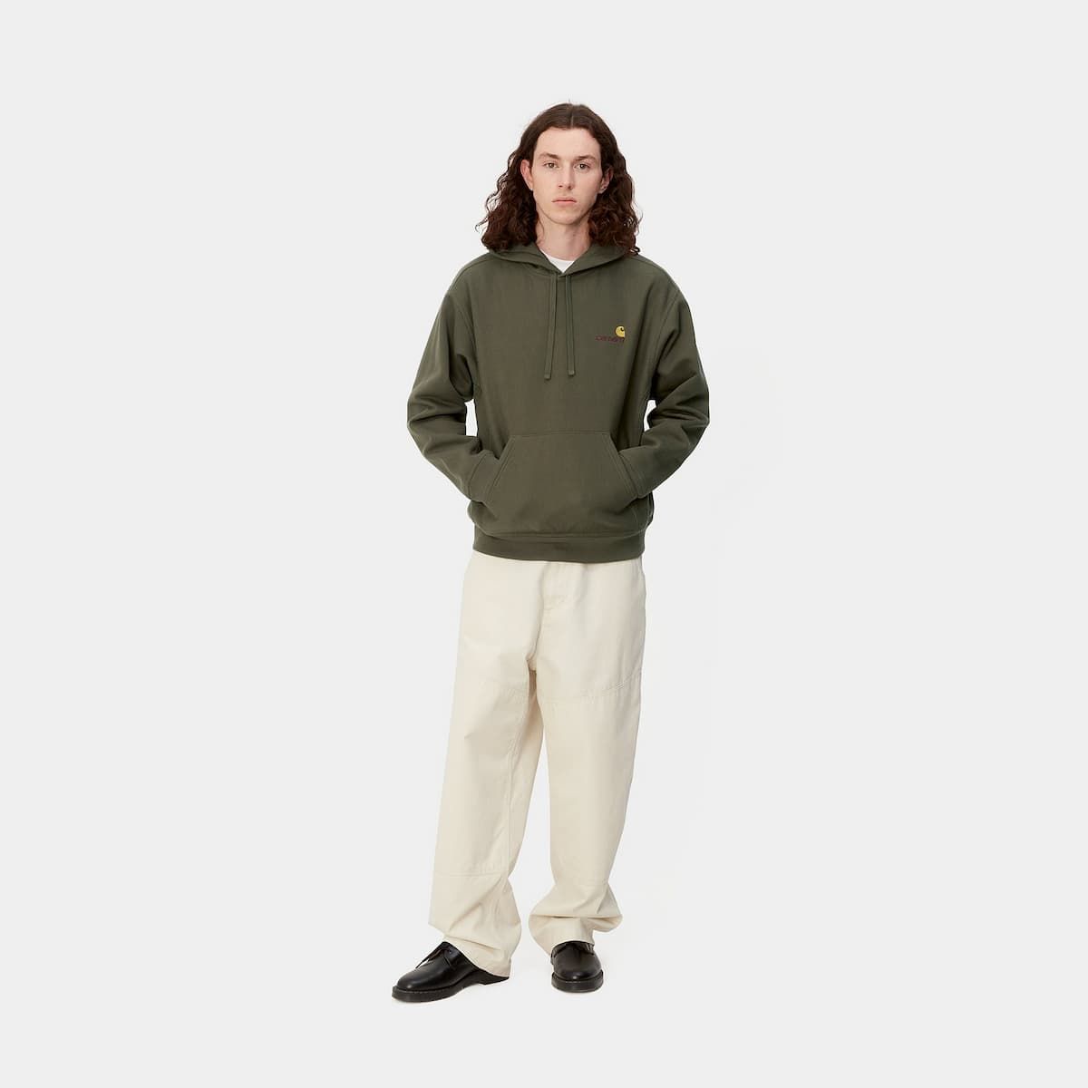 Este hoodie para hombre de ajuste holgado cuenta con tejido peinado para proporcionar mayor suavidad y calidez sin renunciar a la transpirabilidad, capucha ajustable mediante cordón, puños y cintura acanalados, bolsillo tipo canguro y el logo de Carhartt en bordado americano en el lado izquierdo del pecho.