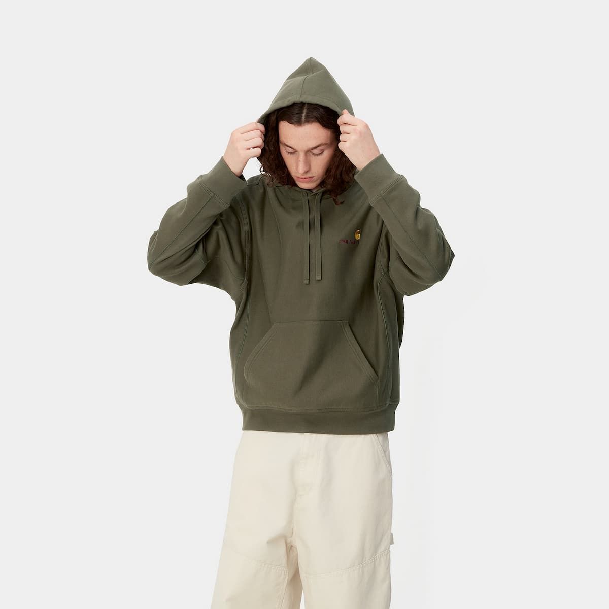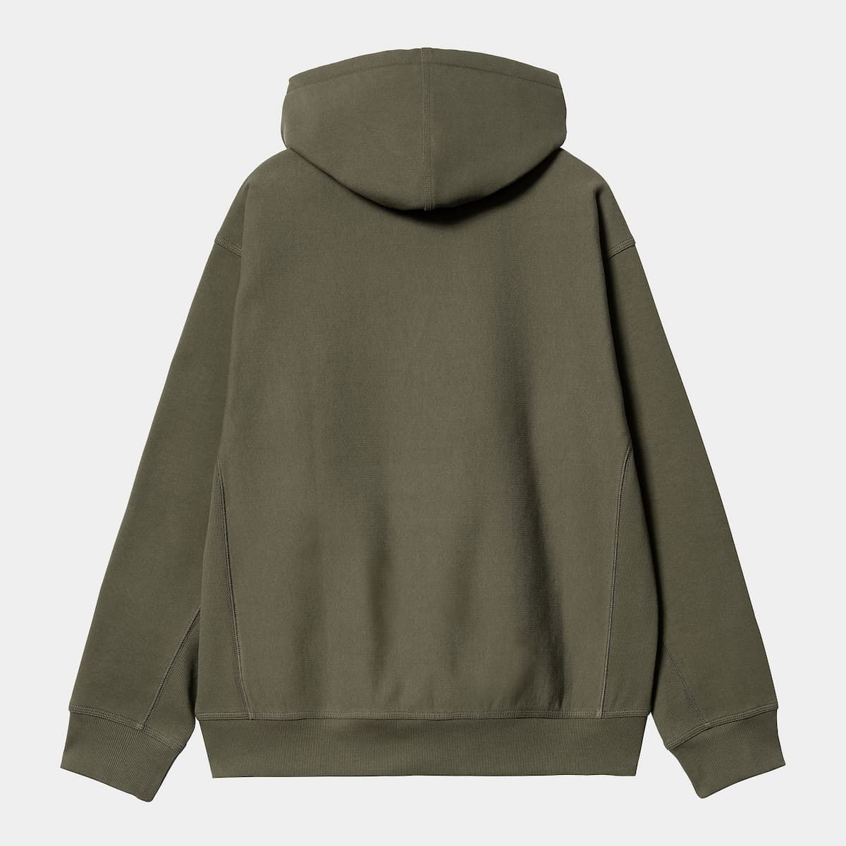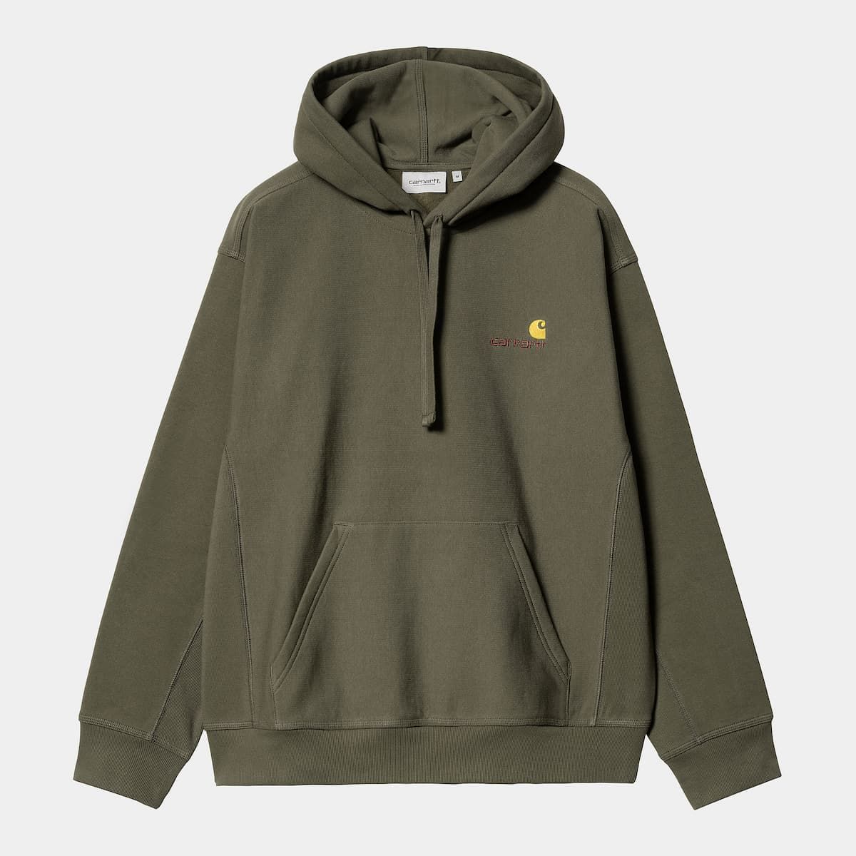 La sudadera con capucha para hombre Hooded American Script Sweat en tono verde militar (Plant) de Carhartt WIP está fabricada con 80% algodón y 20% poliéster (420g/m2).