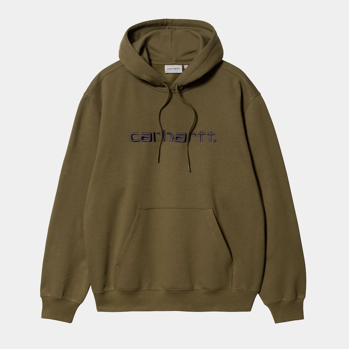 La sudadera con capucha para hombre Hooded Carhartt Sweatshirt en verde con el logo bordado en morado (Highland-Cassis) de Carhartt WIP está confeccionada con mezcla de 58% algodón y 42% poliéster Sweat (440g).