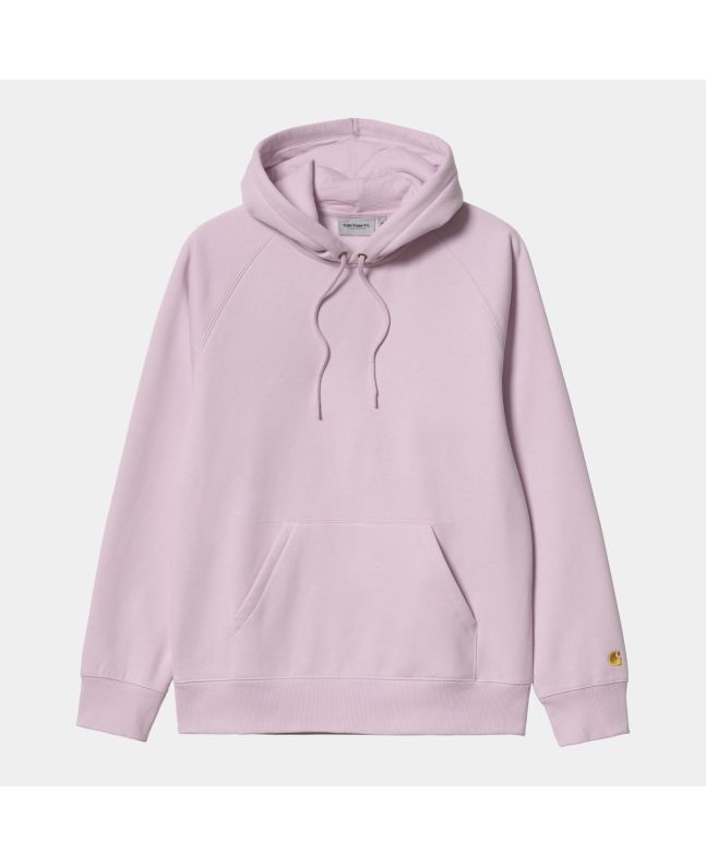 La Hooded Chase Sweat para hombre de Carhartt WIP está disponible en color rosa con el logo de Carhartt en dorado (Pale Quartz-Gold).