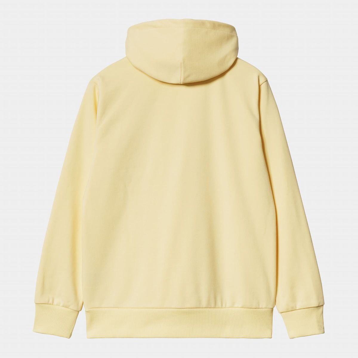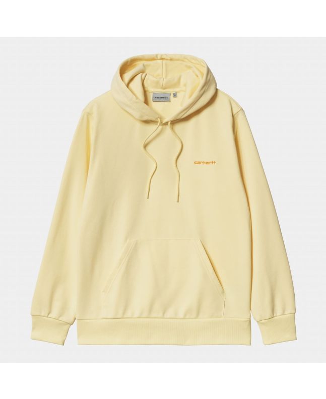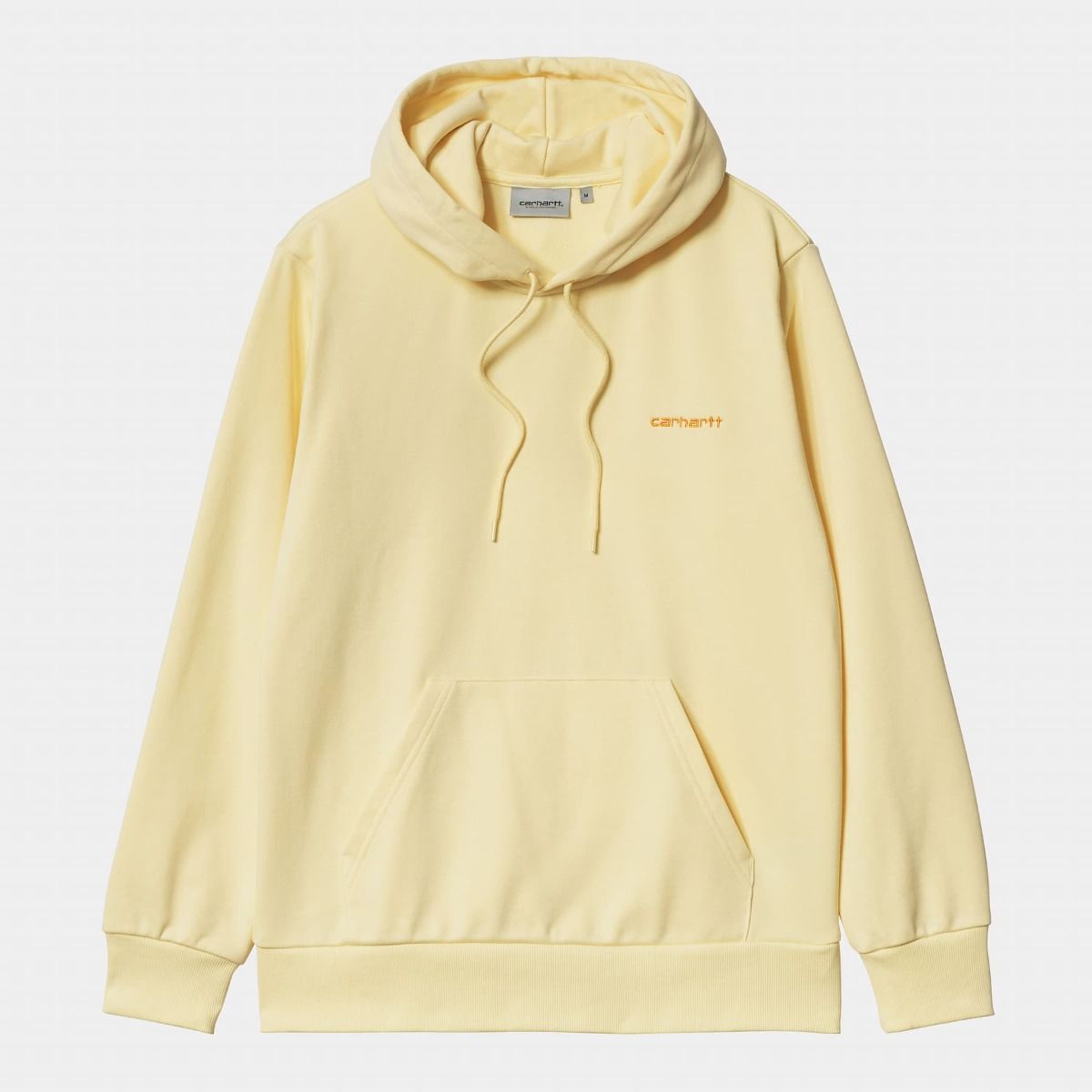 La Hooded Script Embroidery Sweat de Carhartt WIP está disponible en color amarillo con el logo de Carhartt en naranja (Soft Yellow-Popsicle).