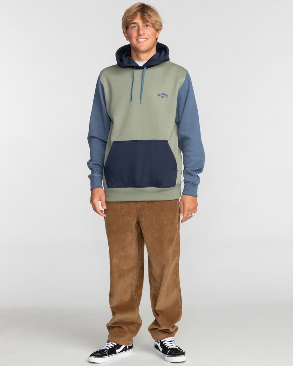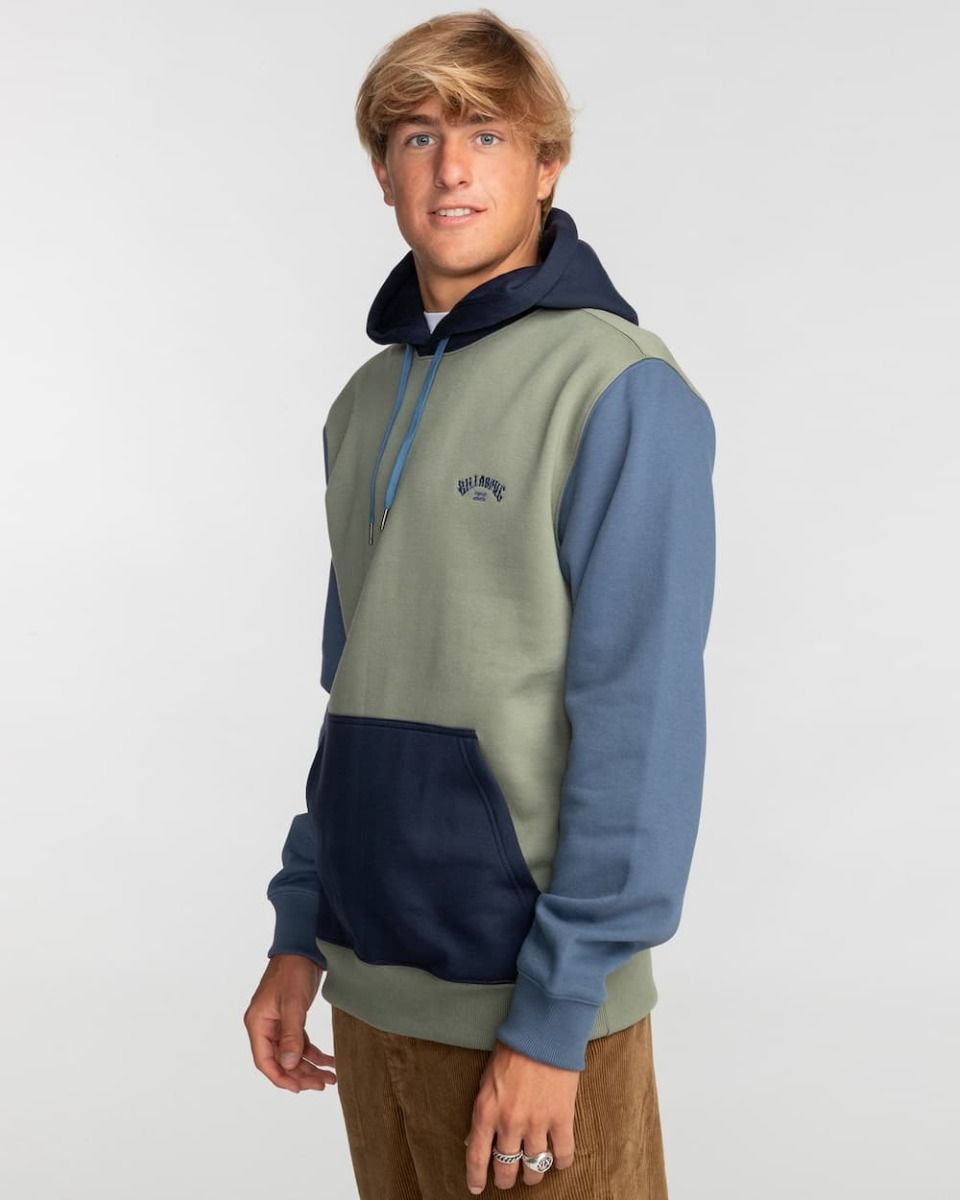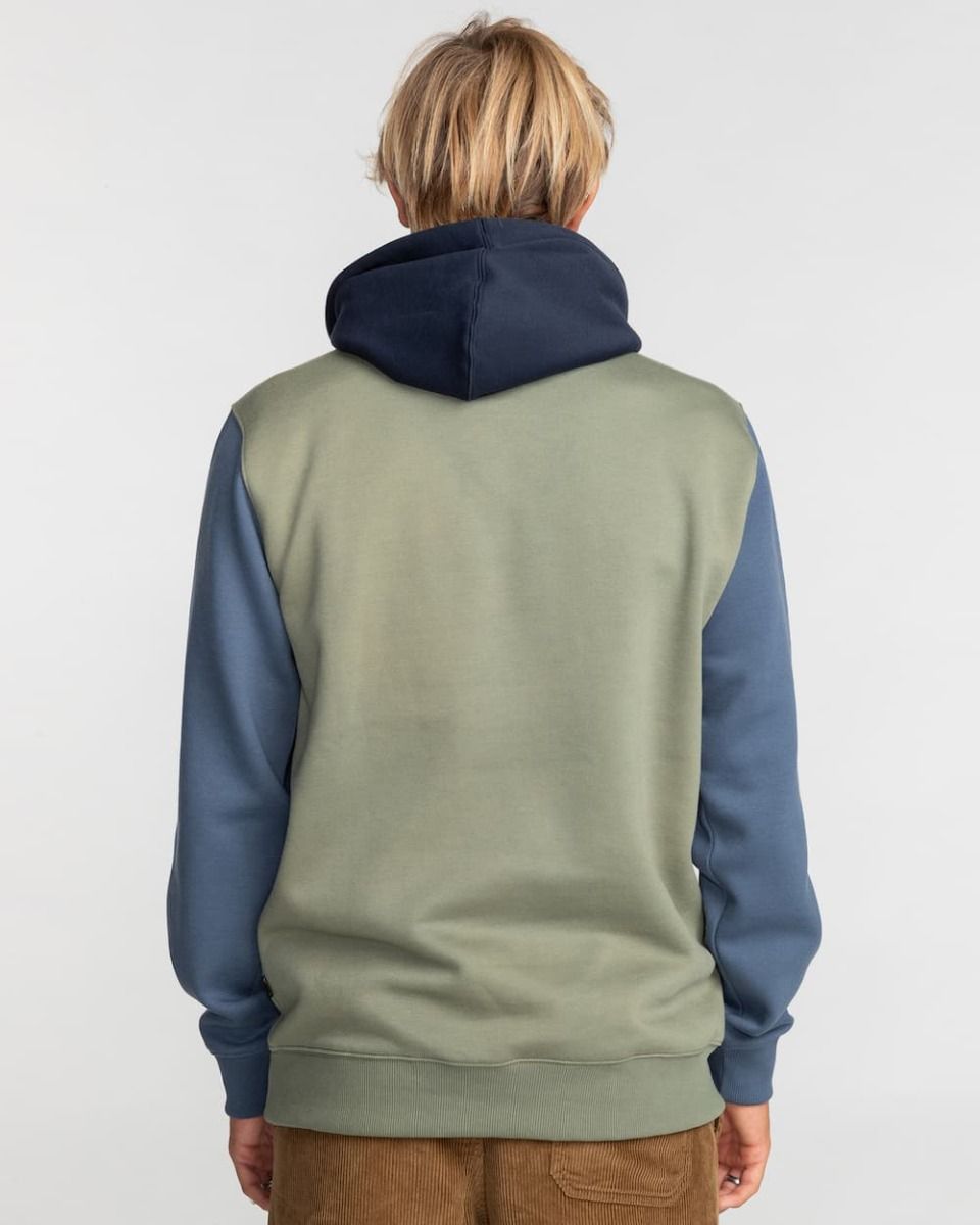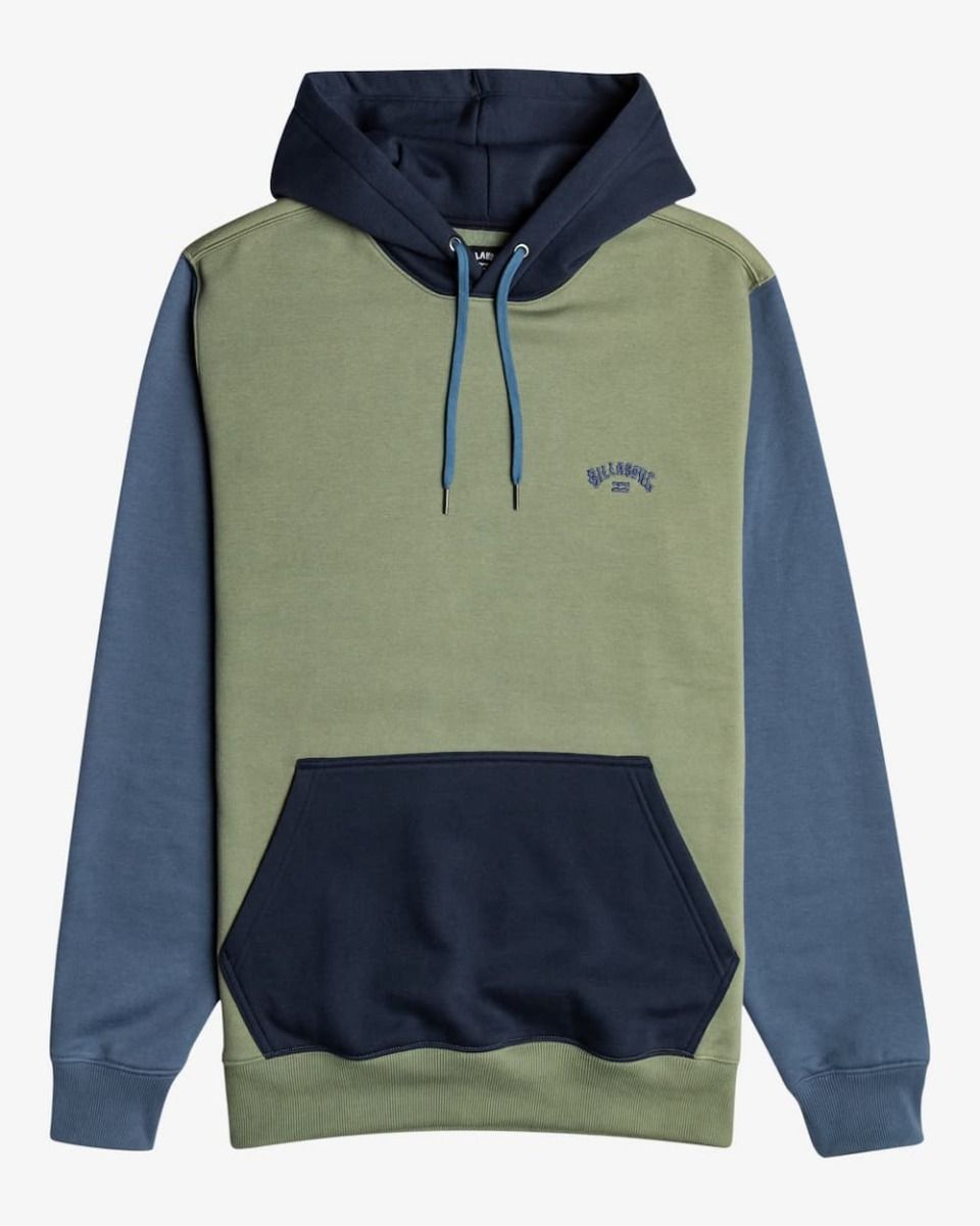 Este hoodie de corte normal cuenta con un diseño en bloques de color verde, azul y azul marino, capucha ajustable mediante cordón, forro interior cepillado, un bolsillo delantero tipo canguro y el logo del arco de Billabong bordado en contraste en el lado izquierdo del pecho.