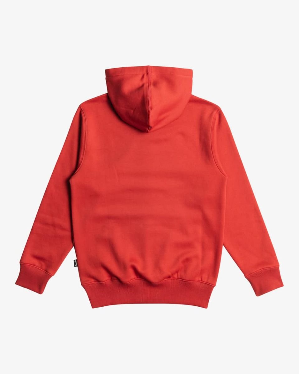 Este hoodie juvenil rojo presenta corte normal, interior cepillado, punto canalé en puños y dobladillo inferior, capucha con cuello, bolsillo tipo canguro y el logo en arco de Billabong bordado en blanco en el lado izquierdo del pecho.