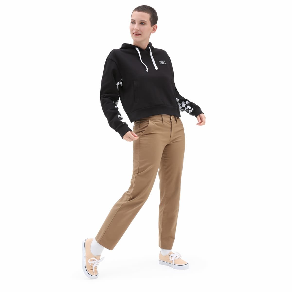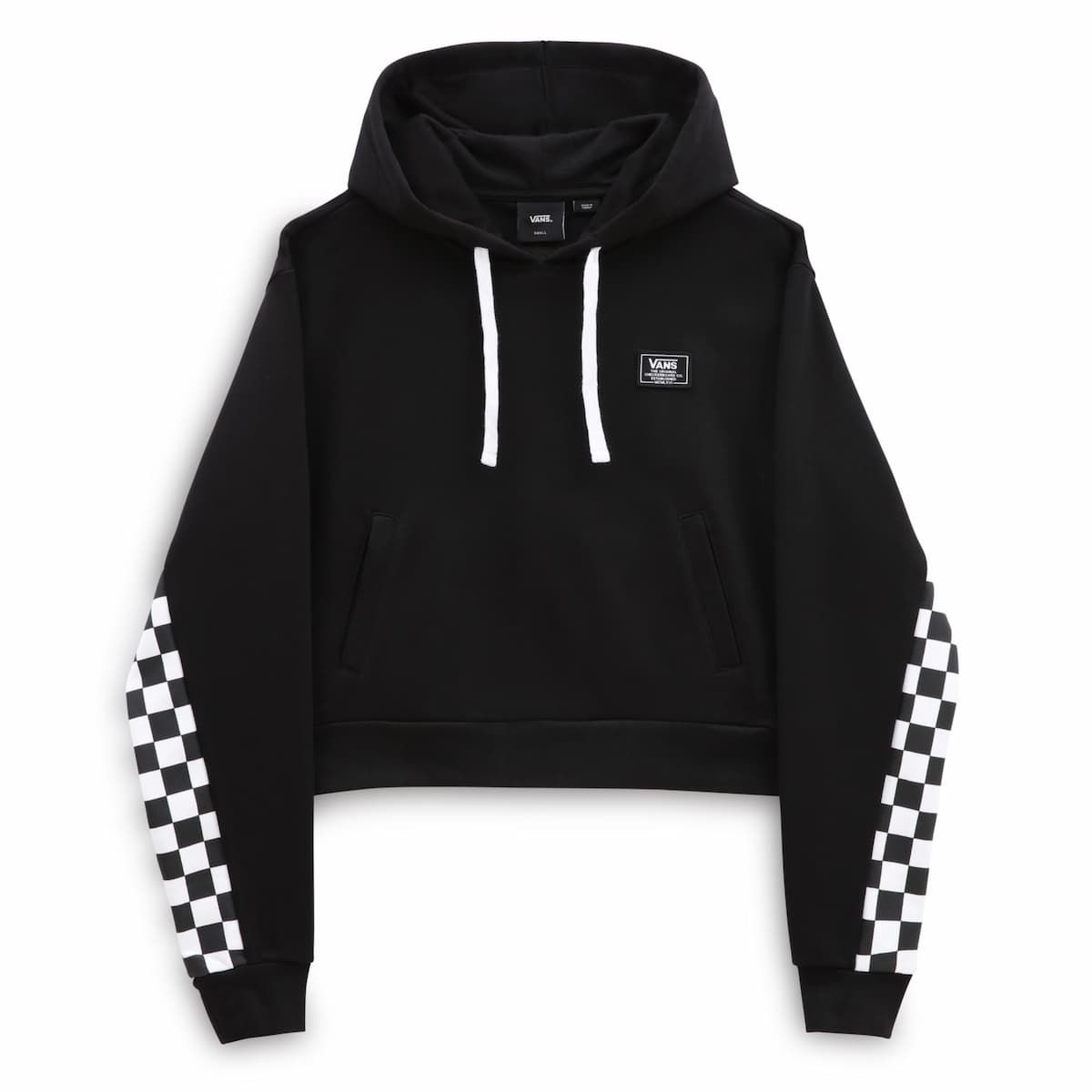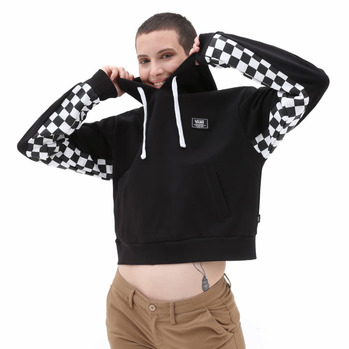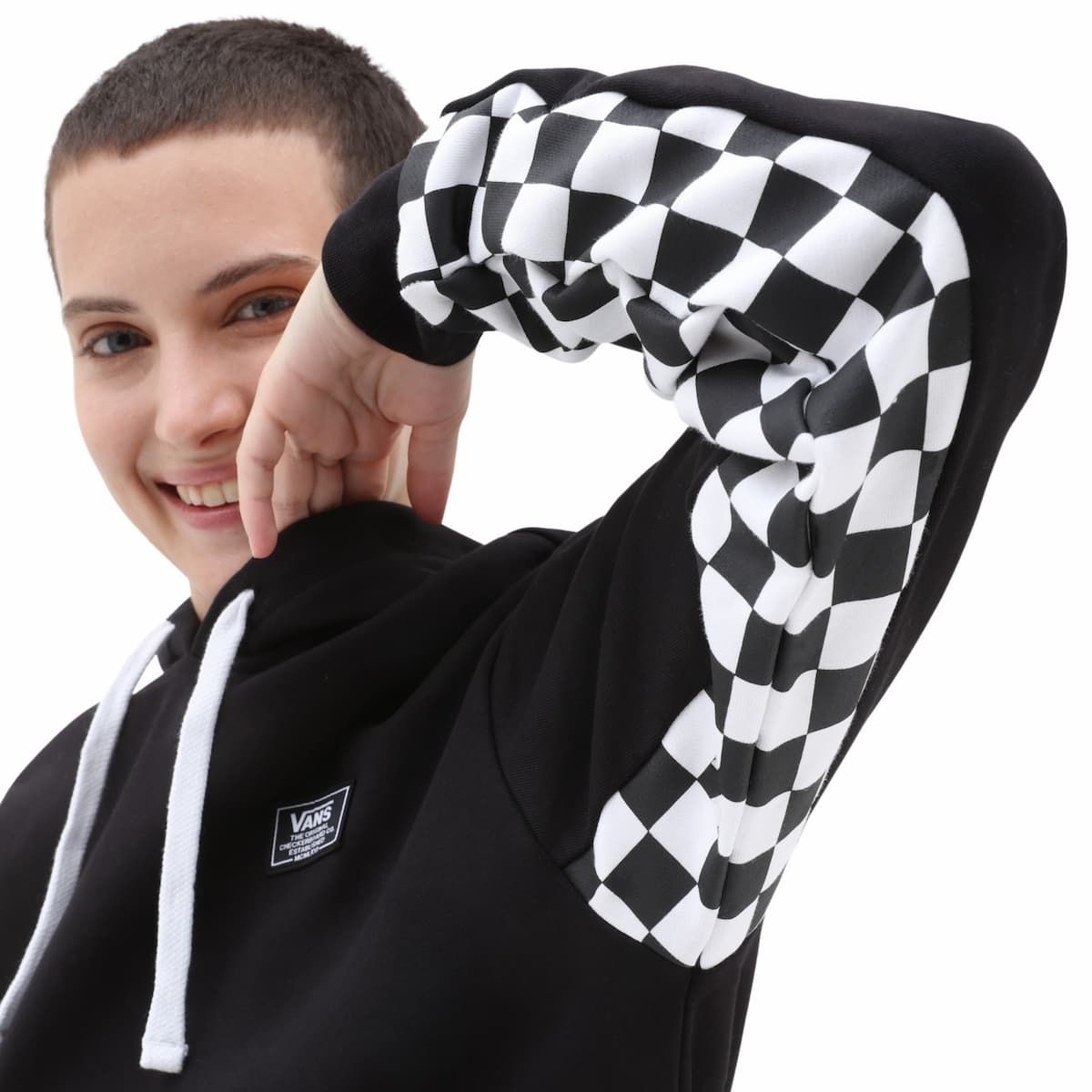 Este hoodie sin cierre cuenta con un cómodo diseño corto y holgado, capucha ajustable mediante cordón, mangas exageradas, cordones planos, bolsillos de ojal, estampado checkerboard en las dos mangas y un parche con el logo de Vans tejido en el lado izquierdo del pecho.