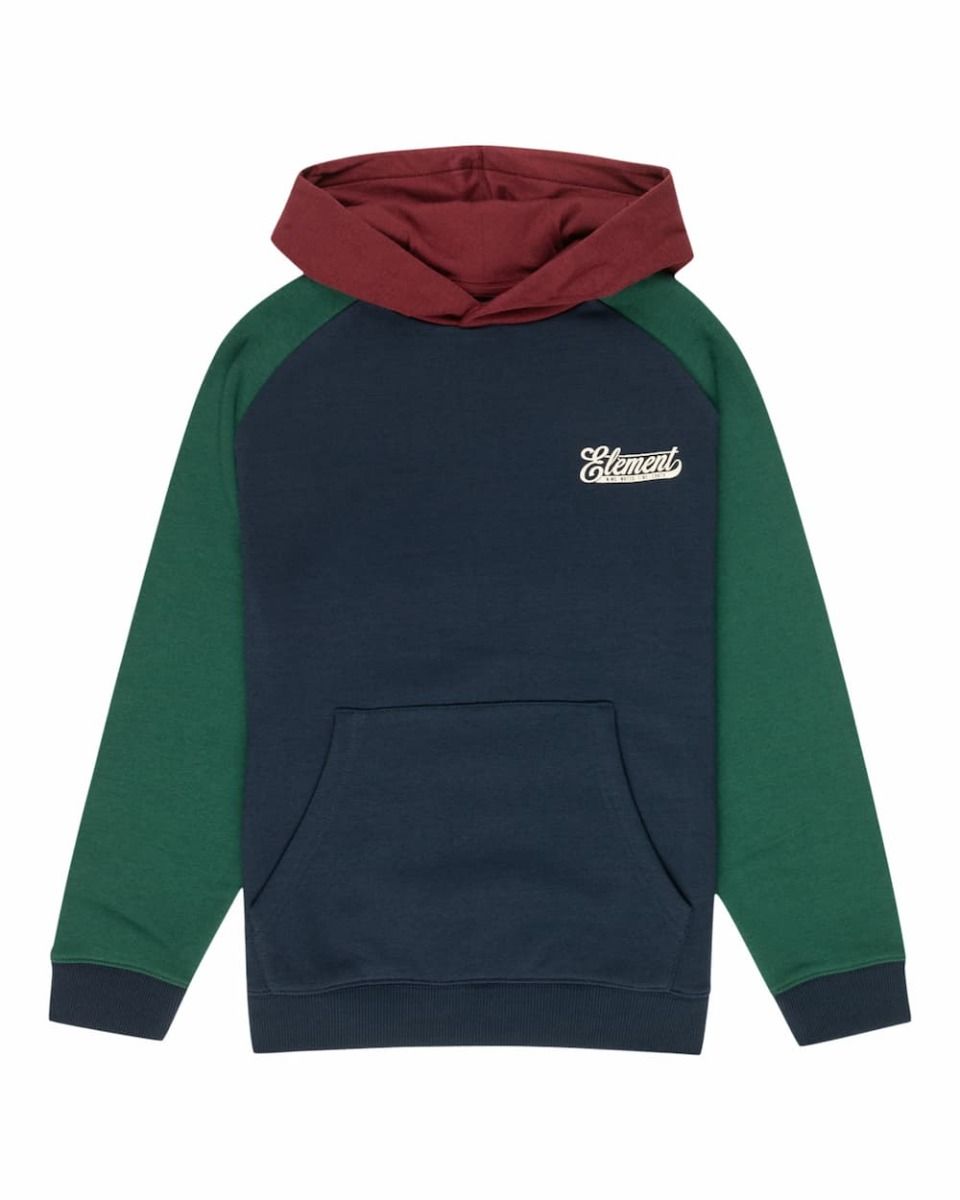 Este clásico hoodie infantil de corte normal cuenta con un diseño en bloques de color azul marino, verde y granate, capucha con abertura cruzada, punto canalé en puños y dobladillo inferior, un bolsillo tipo canguro y la inscripción "Element. Wind-Water-Fire-Earth" estampada en relieve en el lado izquierdo del pecho.