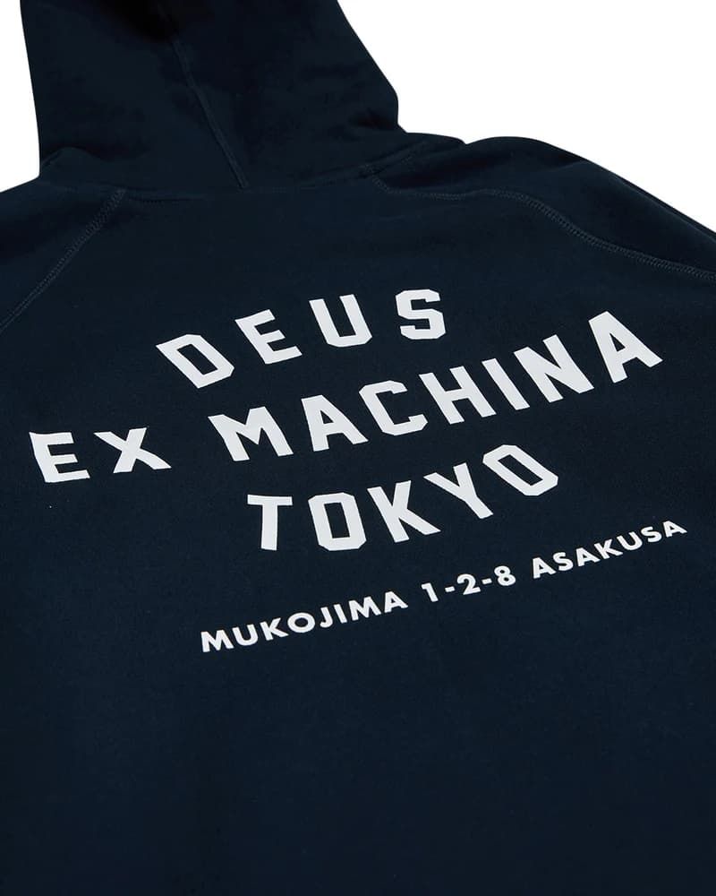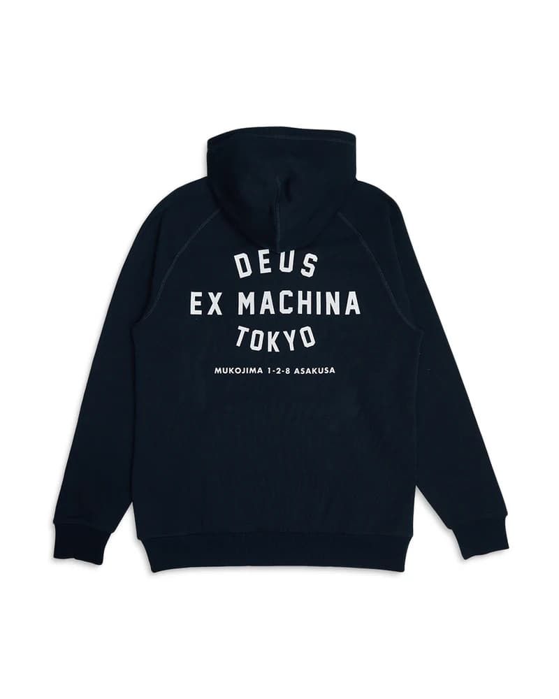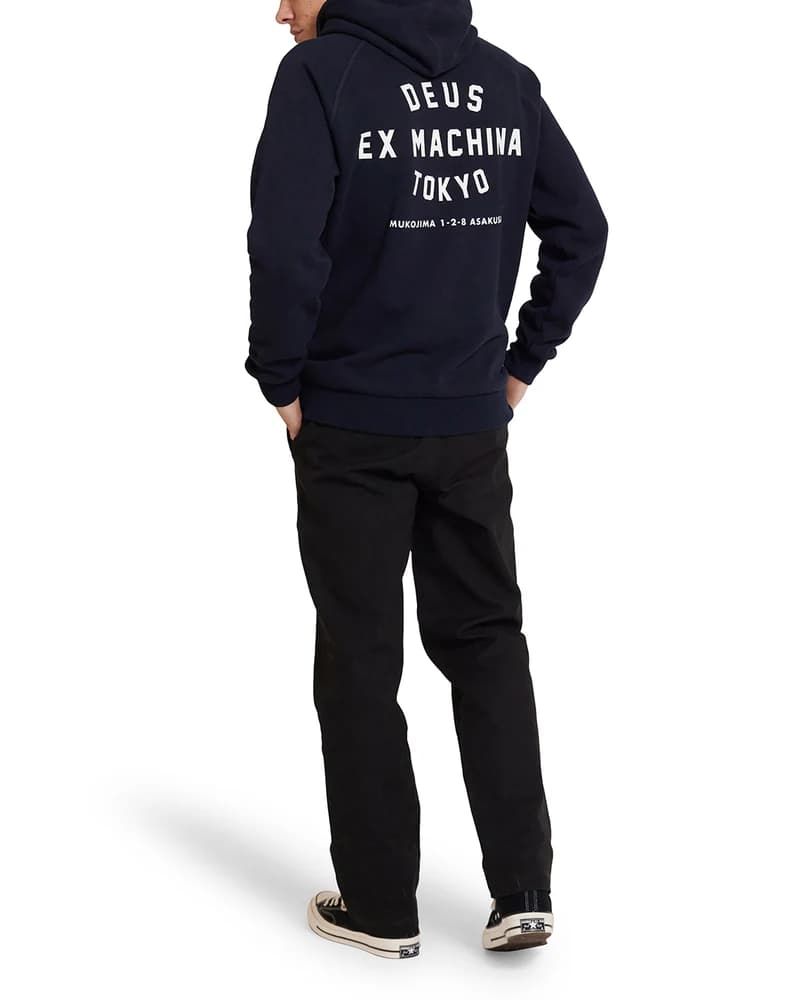 La sudadera con capucha para hombre Tokyo Address Hoodie en azul marino (Navy) de Deus Ex Machina está confeccionada con tejido de algodón orgánico cepillado (350g).