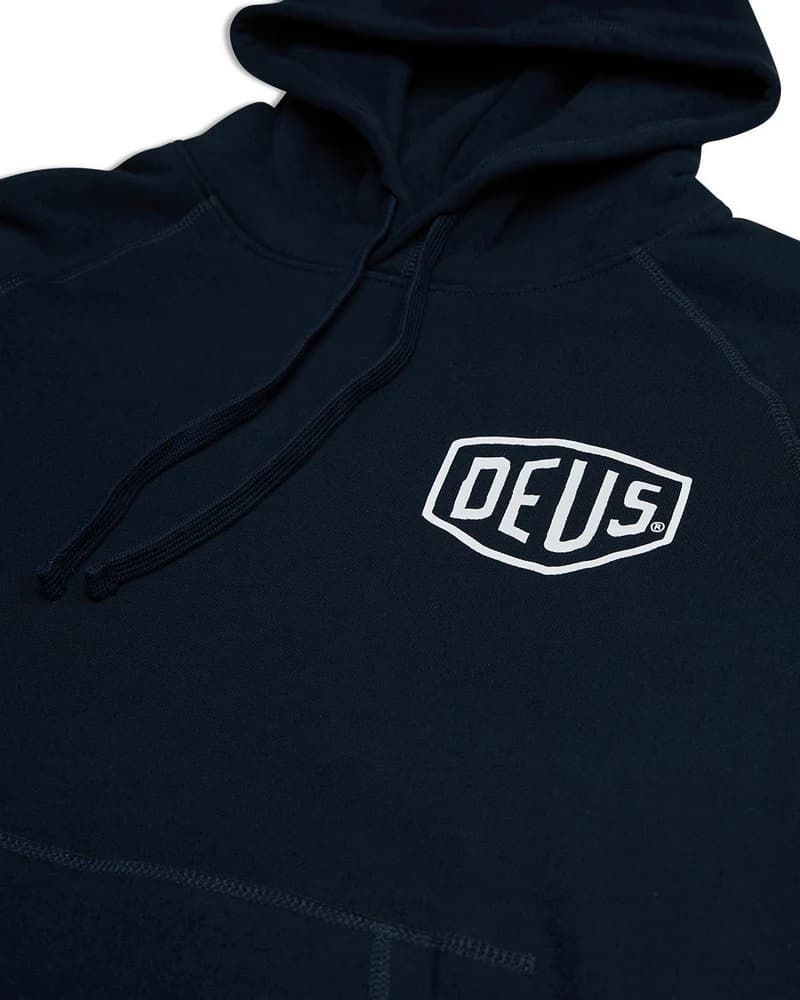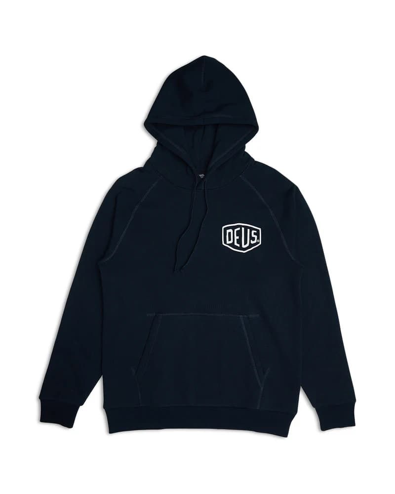 Este hoodie orgánico azul marino de ajuste estándar, perteneciente a la colección "Deus Ex Machina Classics", cuenta con lavado en prenda para mayor suavidad, capucha ajustable mediante cordón, un amplio bolsillo tipo canguro, puños y bajo ribeteados, serigrafiado DEUS en el lado izquierdo del pecho y la inscripción “Deus Ex Machina Tokyo. Mukojima 1-2-8 Asakusa” impresa en la espalda.