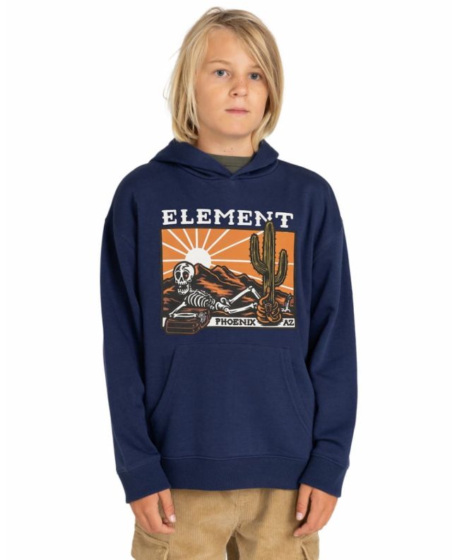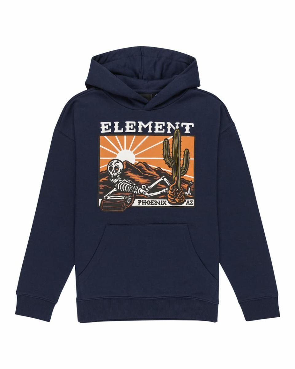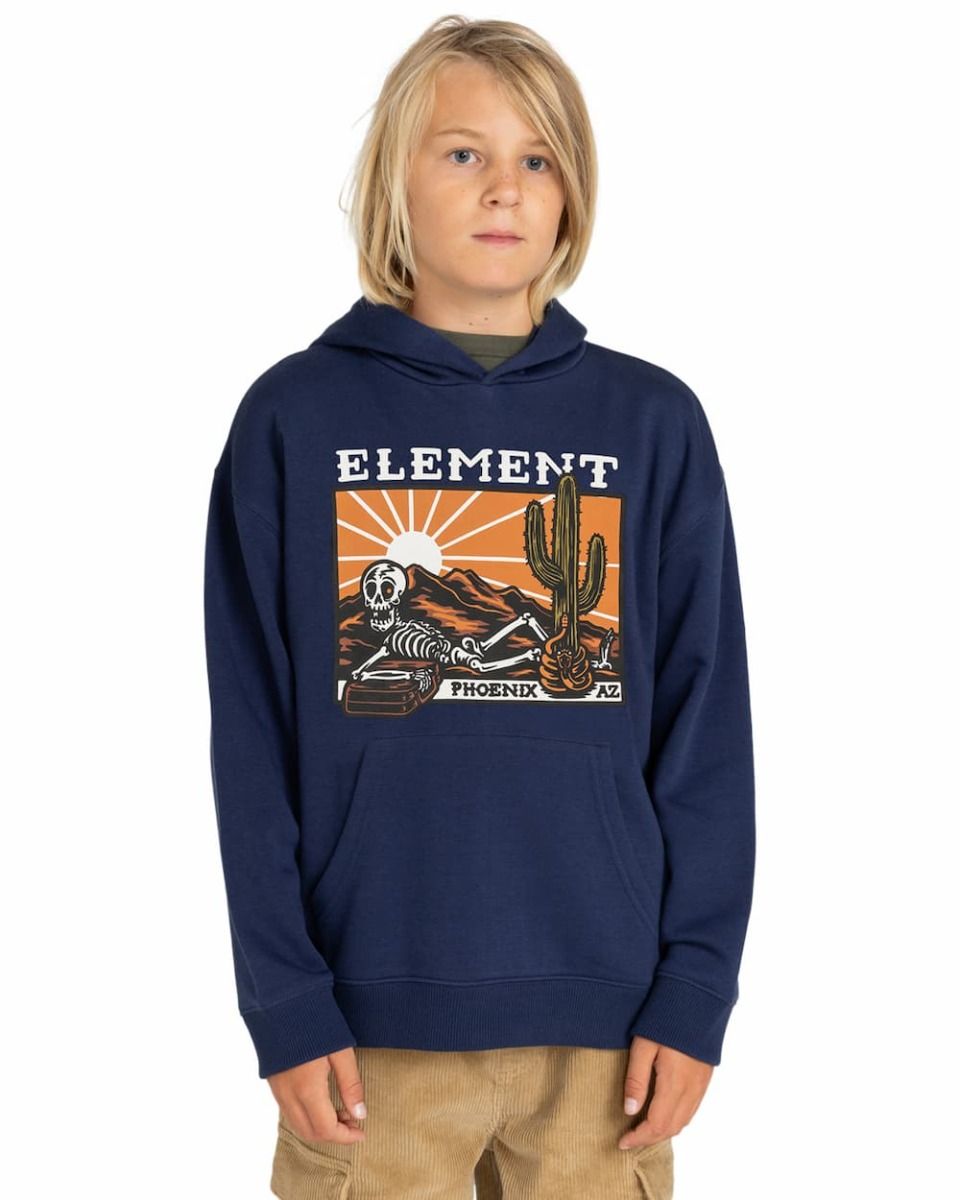 Este hoodie infantil de ajuste regular cuenta con capucha, punto canalé en puños y dobladillo inferior, un bolsillo tipo canguro, un gráfico Element de un esqueleto en el desierto serigrafiado en la parte delantera y una discreta etiqueta de tela con el logo de la marca tejida en la costura lateral.