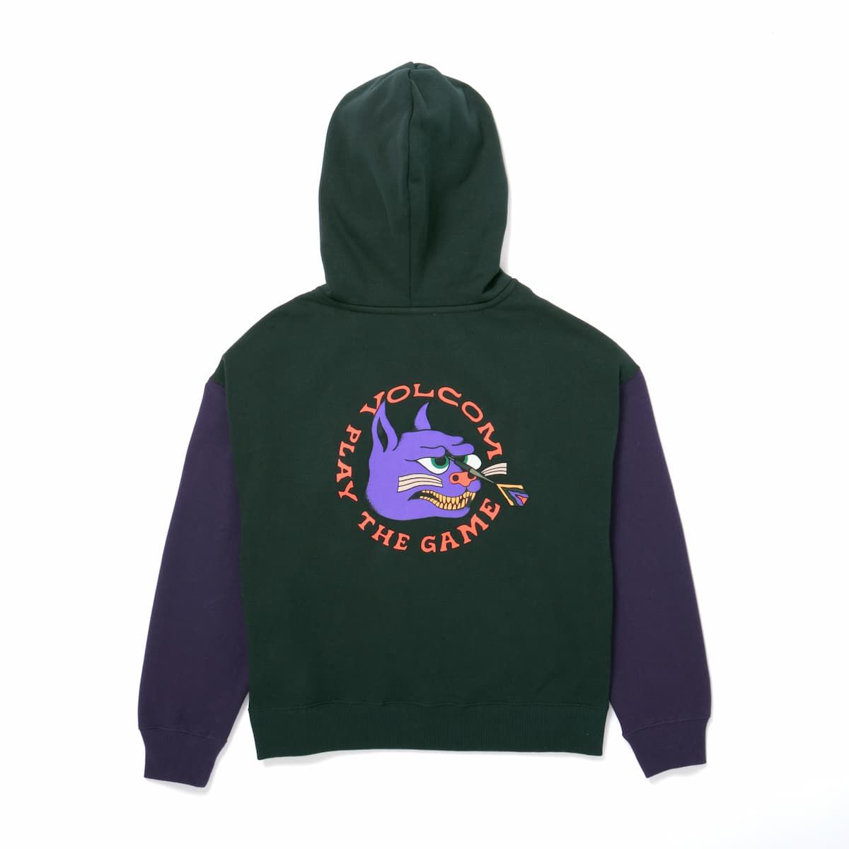 Esta hoodie de corte amplio, perteneciente a la Colección Featured Artist de Volcom, cuenta con tejido afelpado para mayor suavidad y calidez, capucha con elástico en los lados, un amplio bolsillo tipo canguro, mangas en contraste, diseño artístico de Nando Von Arb impreso en el pecho y la espalda, junto con una etiqueta de Featured Artist tejida en la costura lateral.