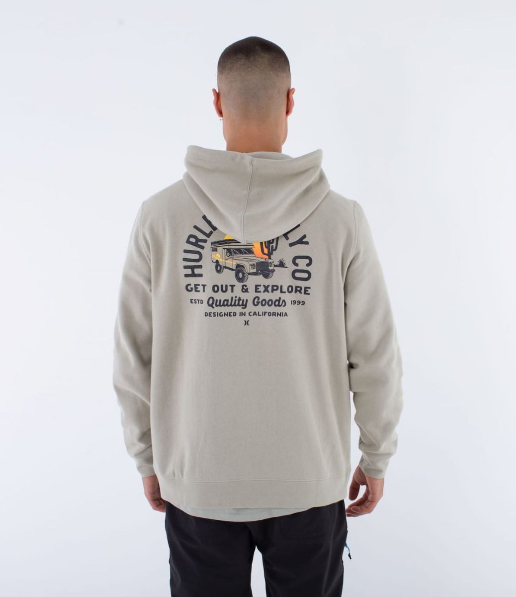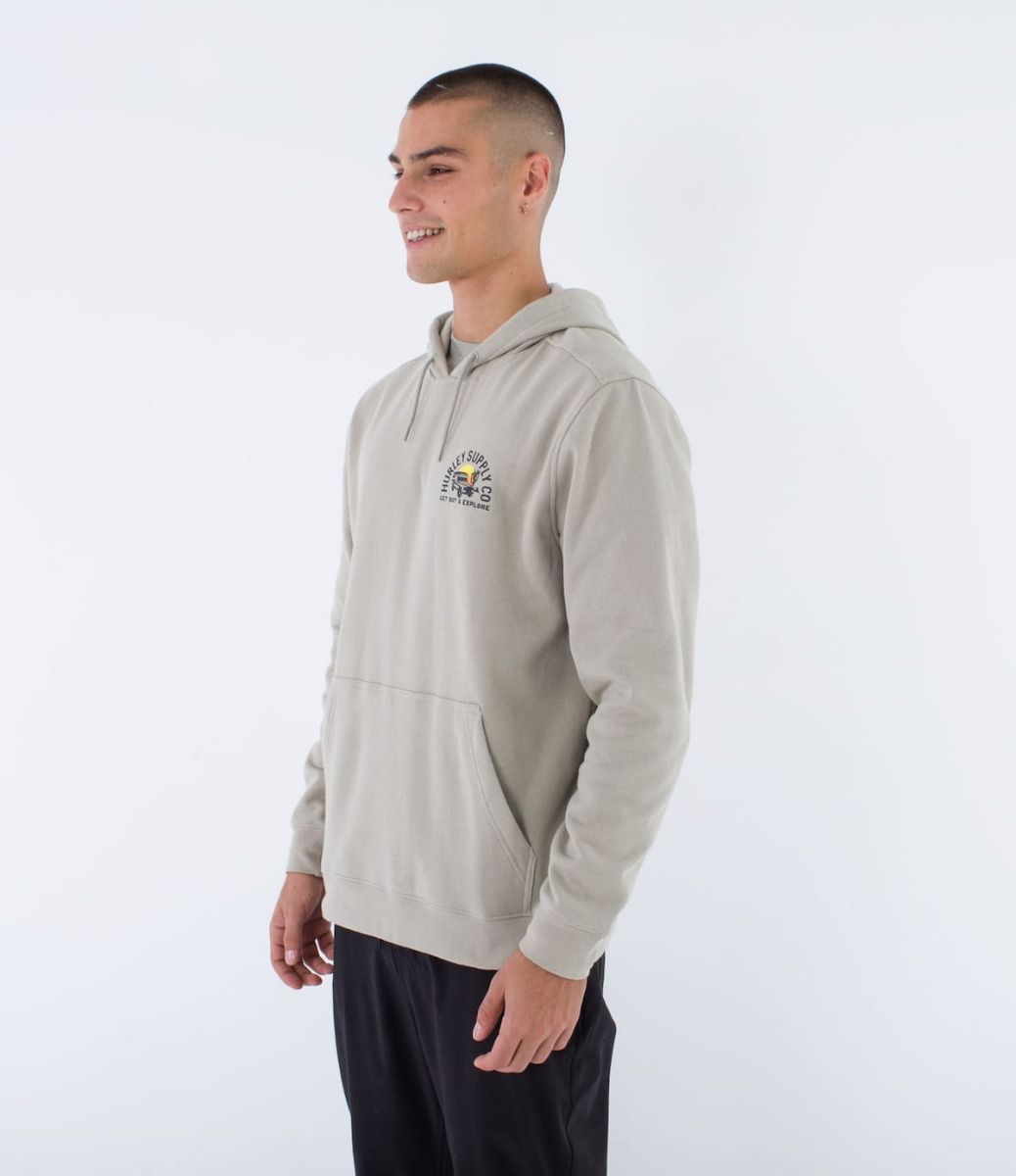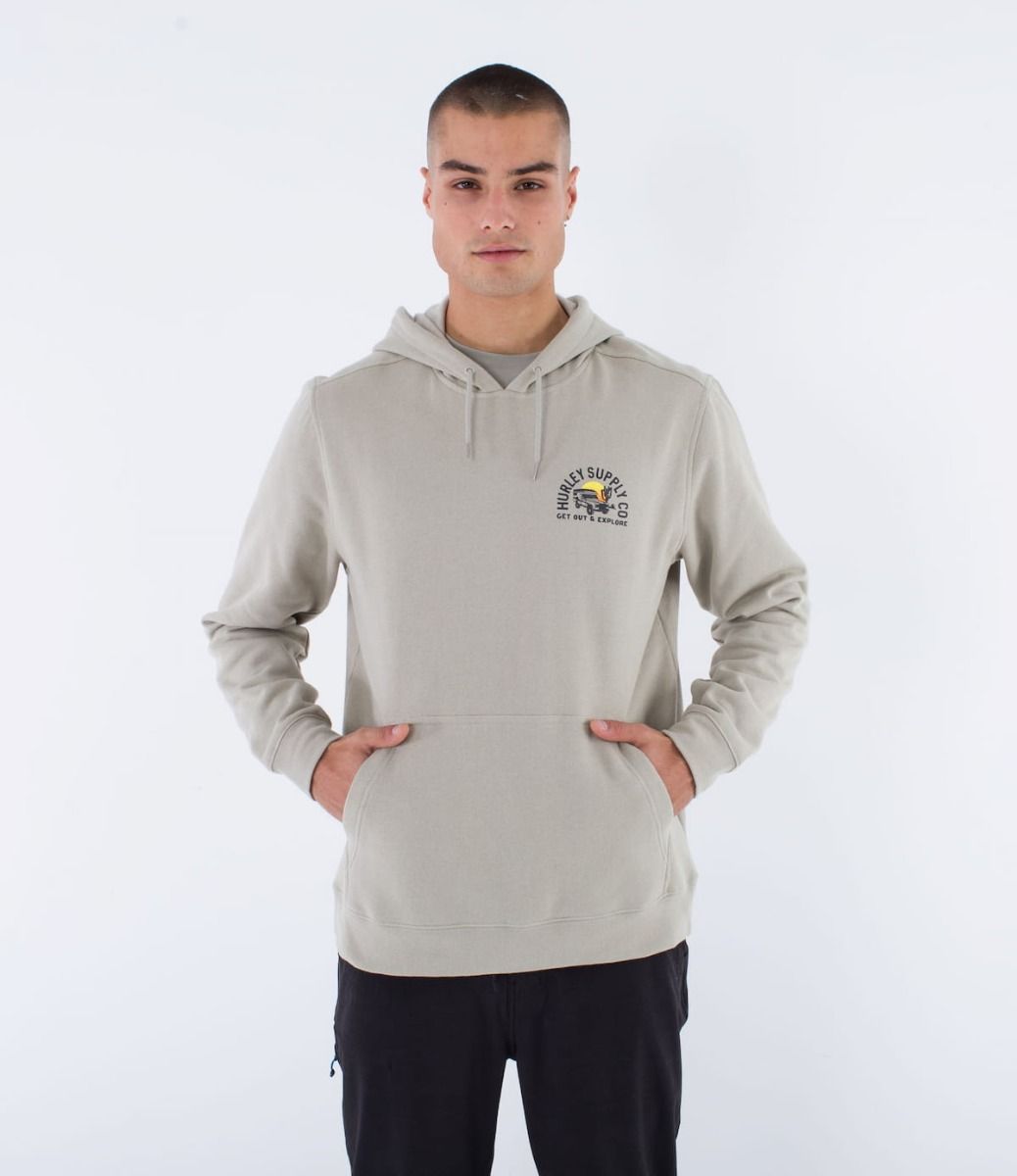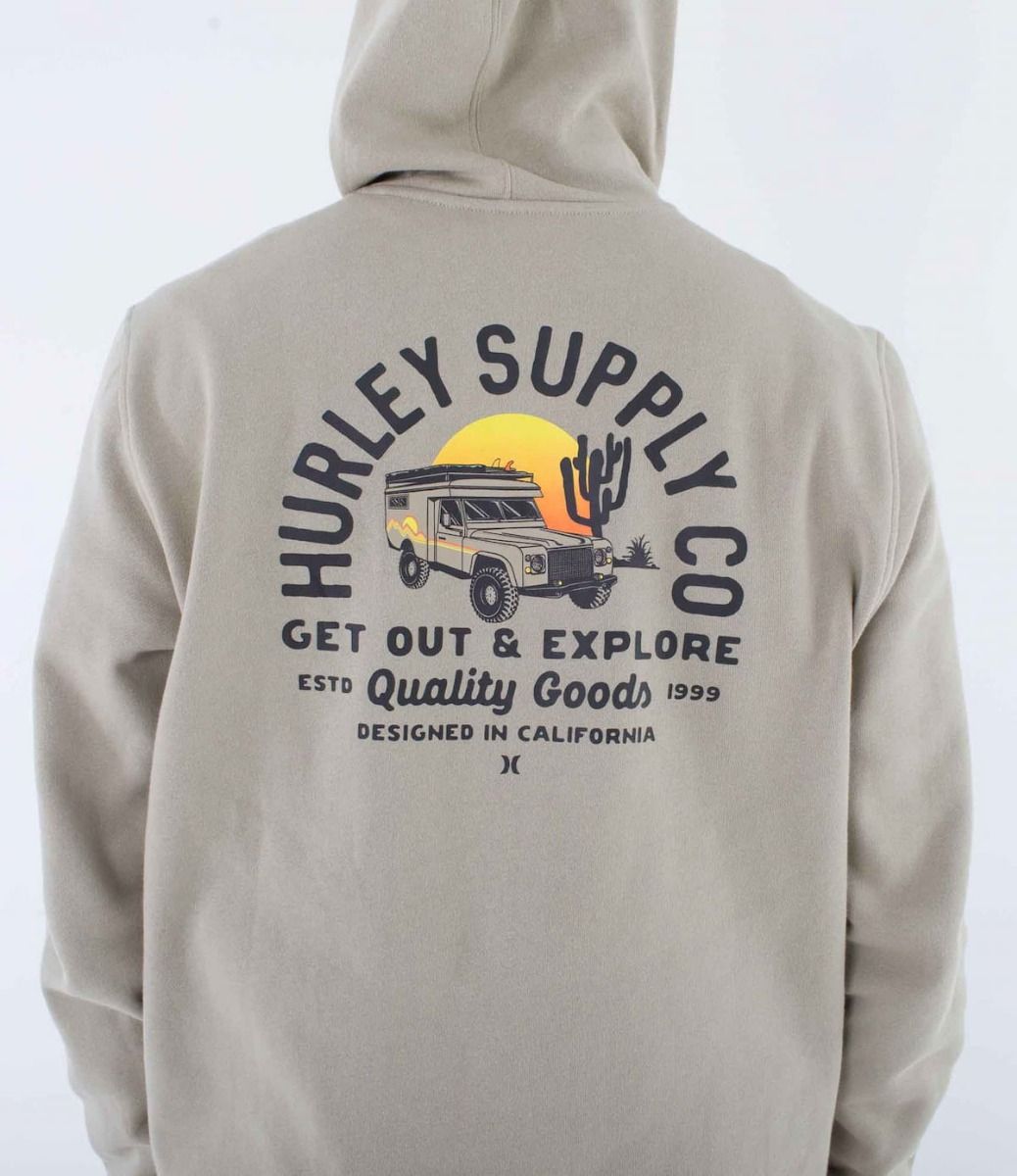 Esta hoodie de corte clásico cuenta con forro interior polar, capucha ajustable mediante cordones DTM, puños y bajo inferior acanalados, un bolsillo tipo canguro, junto con serigrafiado suave Hurley Supply Co, junto con un gráfico de un coche y la inscripción "Get out and explore" (Sal y explora) impresos en el lado izquierdo del pecho y en la espalda.
