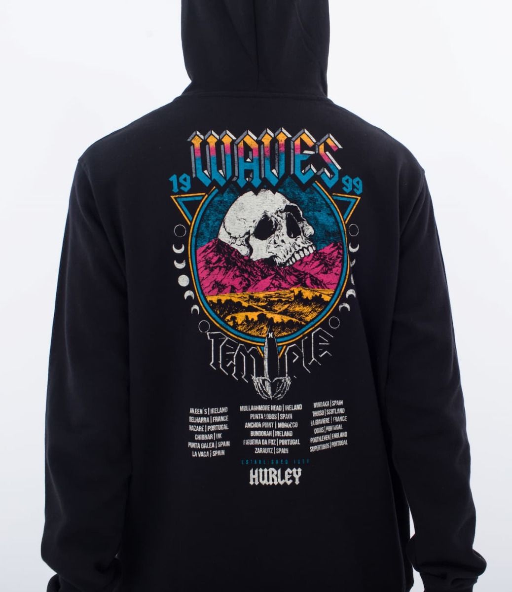 La sudadera con capucha Wave Tour negra para hombre tiene una etiqueta de garantía Hurley One and Only tejida en el dobladillo inferior.