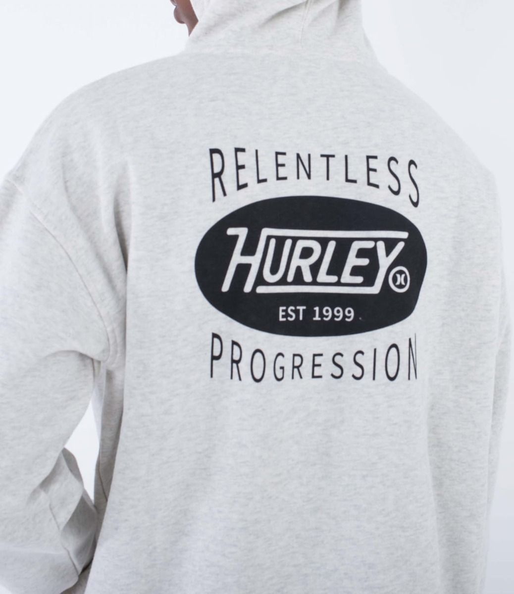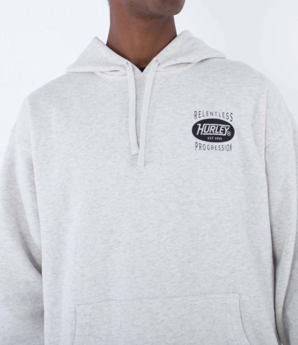 Esta hoodie de corte oversize cuenta con forro interior polar, capucha forrada ajustable mediante cordones, puños y bajo inferior acanalados, un bolsillo tipo canguro, junto con serigrafiado suave sin PVC ni ftalatos "Relentless Progression - Hurley Est 1999" impreso en el lado izquierdo del pecho y en la espalda.