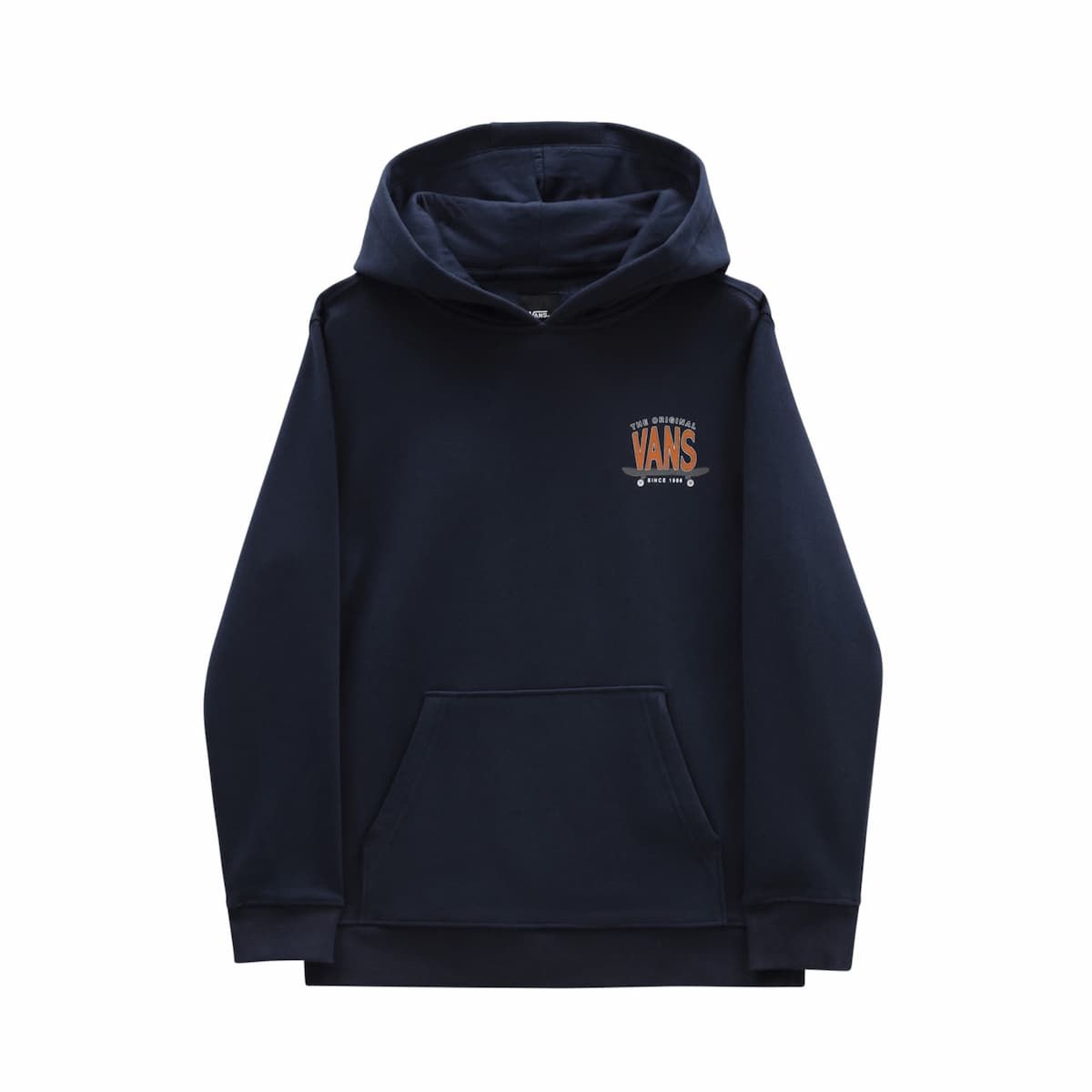 Este hoodie juvenil color azul marino cuenta con corte relajado, capucha sin cierre, un bolsillo delantero tipo canguro, puños y dobladillos acanalados, forro interior, serigrafiado Vans junto con un gráfico de skate impresos en el lado izquierdo del pecho y en la espalda.