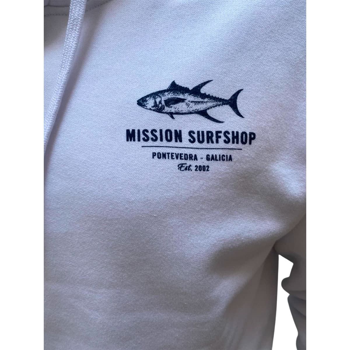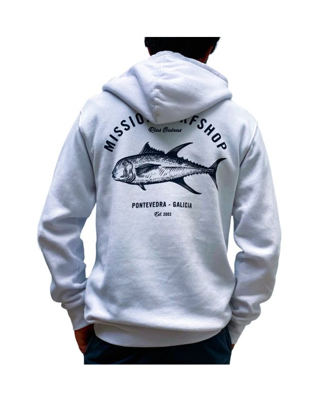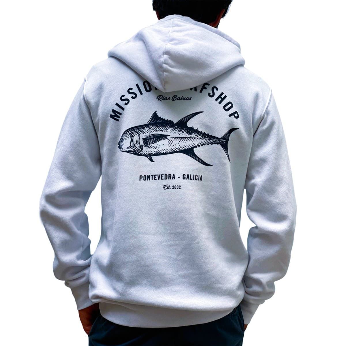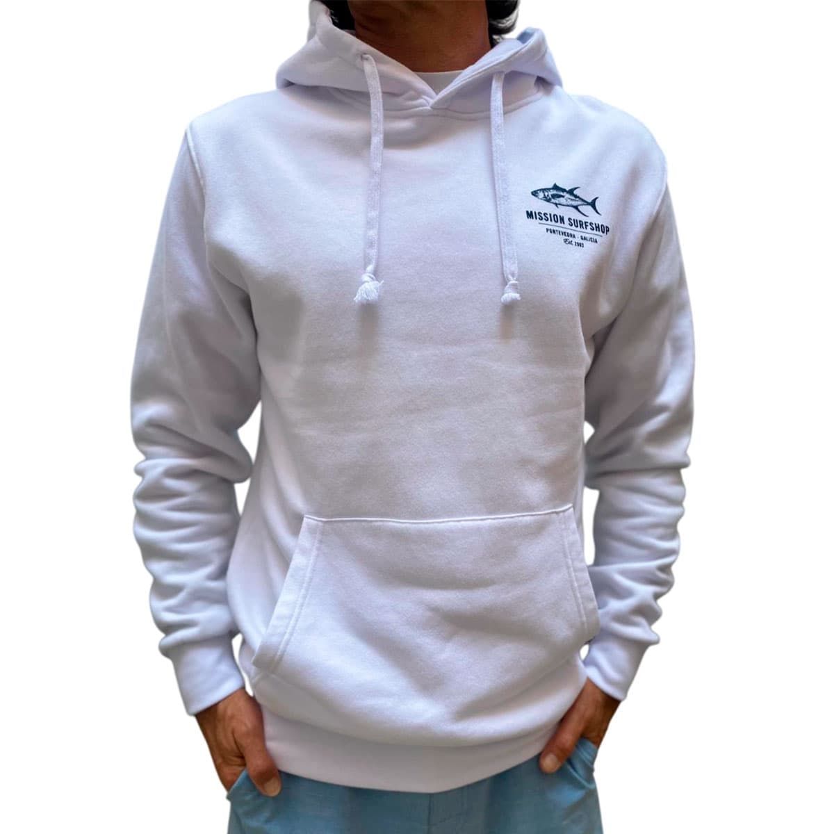 La sudadera con capucha para hombre y mujer Mission Logo Atún Hoodie en blanco (White) es la elección perfecta para los amantes del surf que buscan un look inspirado en el mar y en Galicia.