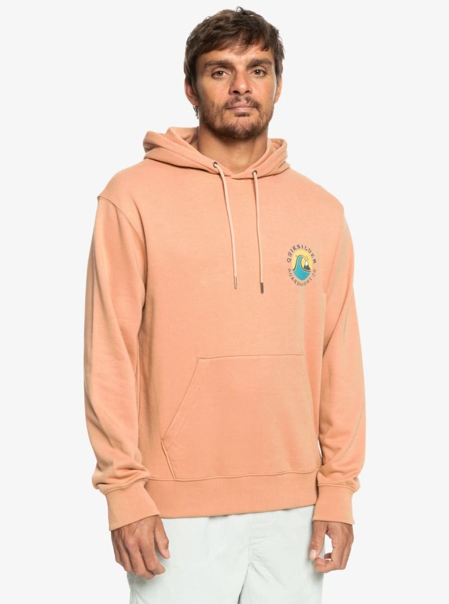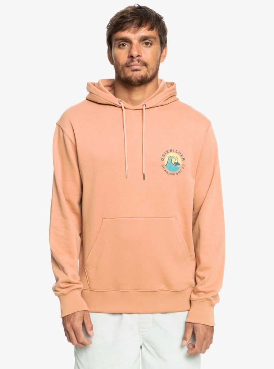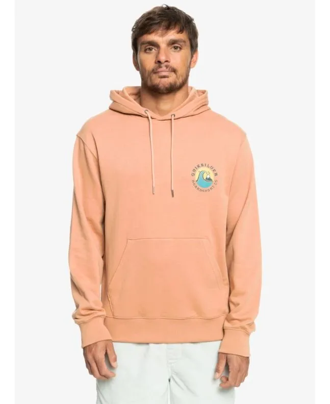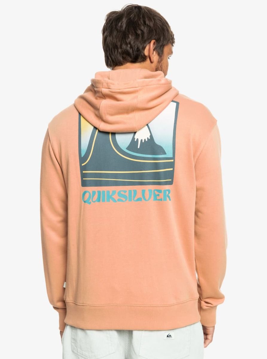 Este hoodie sostenible de corte cómodo cuenta con capucha ajustable mediante cordón, puños y dobladillo inferior acanalados, ojales metálicos, cordones redondos en el mismo tono de la sudadera, un amplio bolsillo tipo canguro, serigrafiado Quiksilver en el lado izquierdo del pecho y un gran estampado con el logo de la ola y la montaña en la espalda.