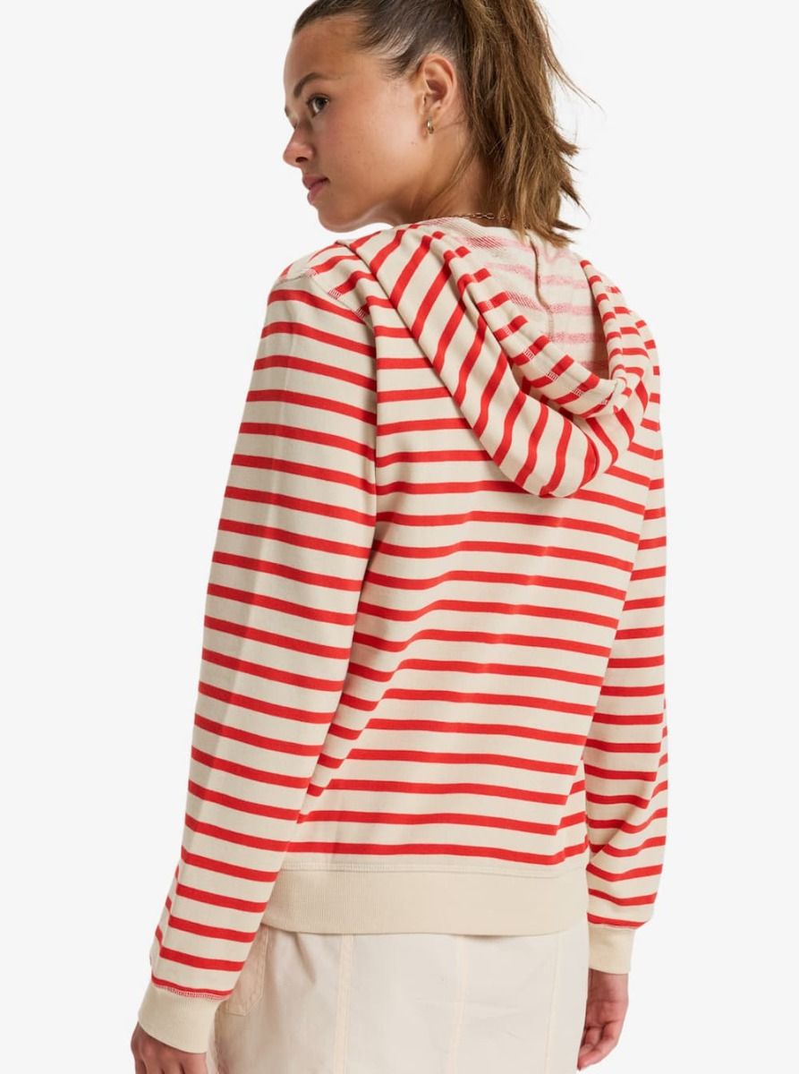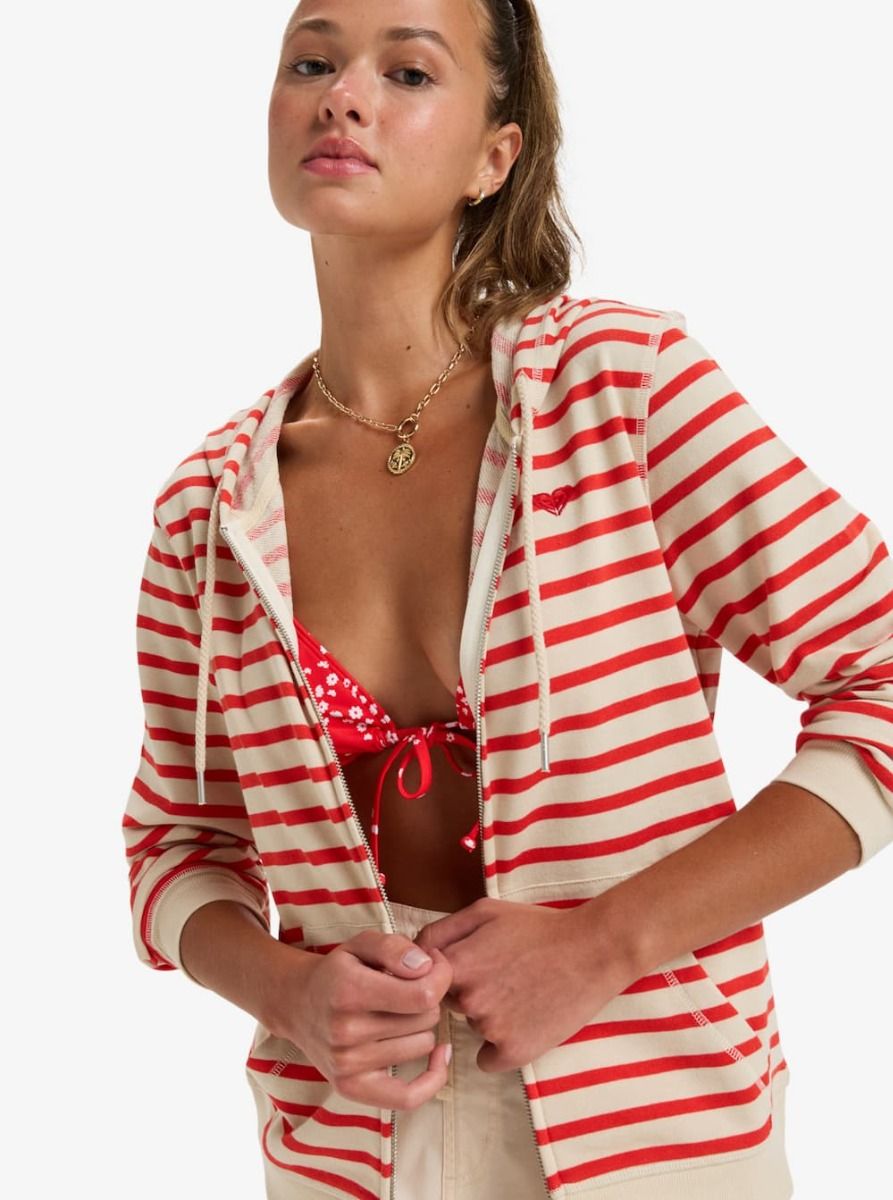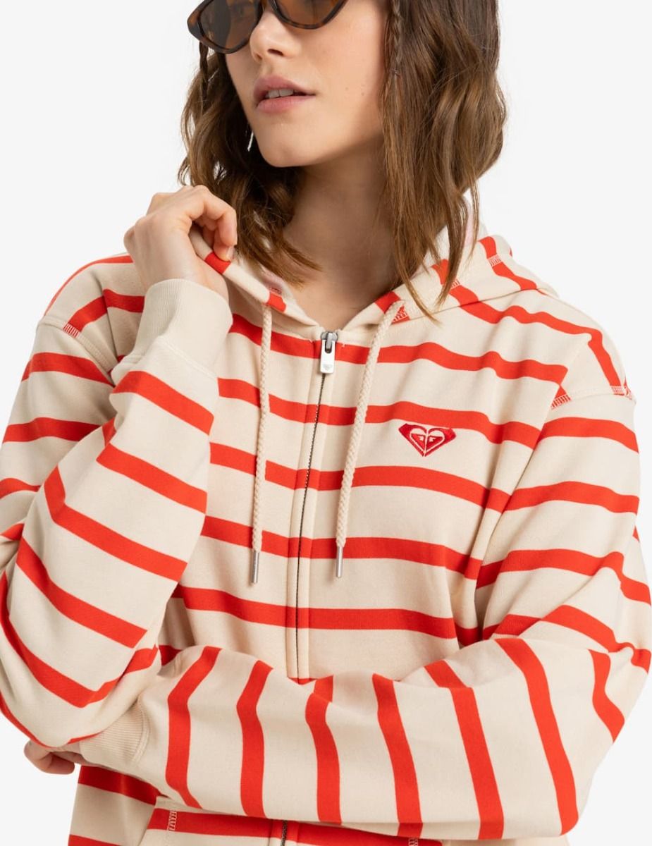 Sudadera Roxy de rayas rojas, con capucha y cremallera. Tejido suave y logo bordado para moverte con libertad.