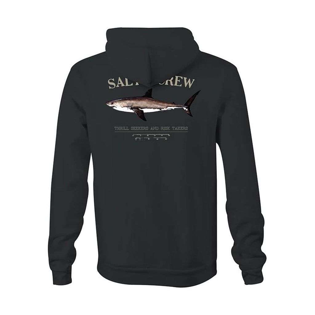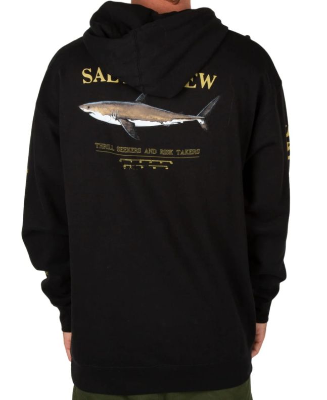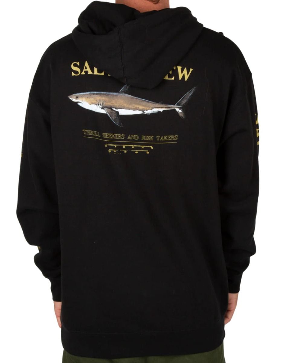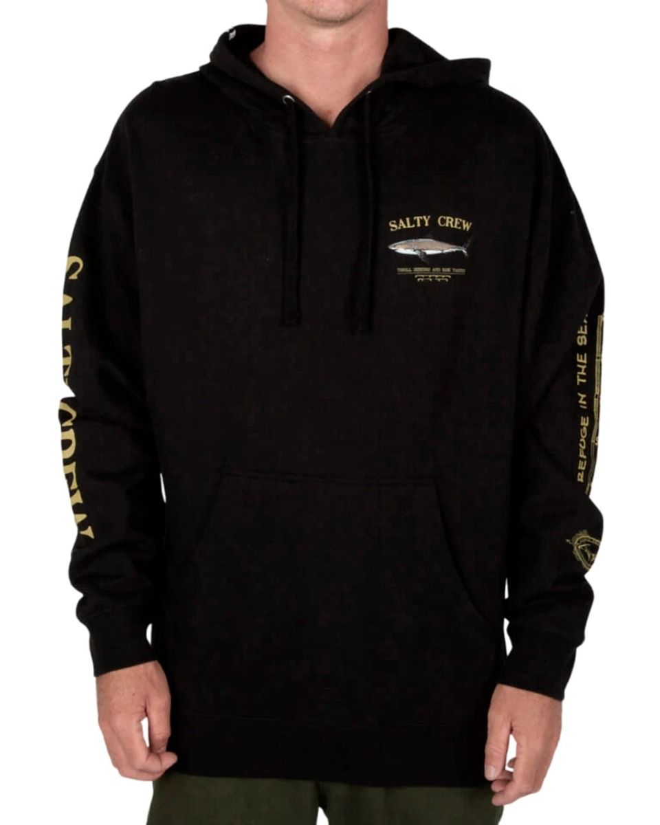 Este hoodie negro cuenta con capucha ajustable mediante cordón, forro interior, bolsillo tipo canguro, un gráfico original Salty Crew de una captura con la inscripción "Thrill Seekers and Risk Takers" (Los que buscan emociones y se arriesgan) serigrafiados en el lado izquierdo del pecho y en la espalda, junto con serigrafiado Salty Crew y "Find Refuge in the Sea" (Encuentra refugio en el mar) impresos en las mangas.