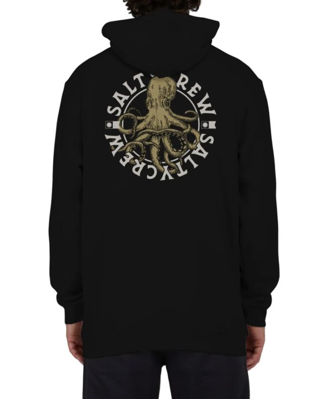 Este hoodie negro cuenta con capucha ajustable mediante cordón, interior de forro polar, bolsillo tipo canguro, serigrafiado Salty Crew en las mangas y estampado original de Salty Crew y un pulpo impresos en el lado izquierdo del pecho y en la espalda.