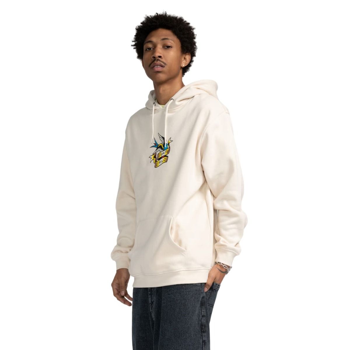 Este hoodie de ajuste regular presenta forro interior cepillado para mayor suavidad, capucha ajustable con cordón, un bolsillo tipo canguro para mantener tus manos calientes o guardar tus objetos esenciales, junto con un gráfico delantero de Santa Cruz y un gorrión con estética de tatuaje inspirado en la primera tabla de skate profesional del rider Justin Sommer.