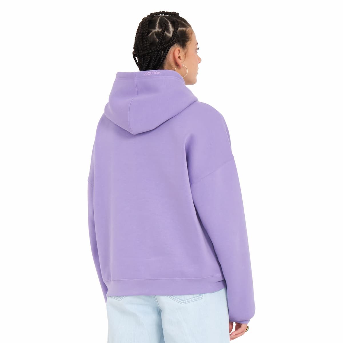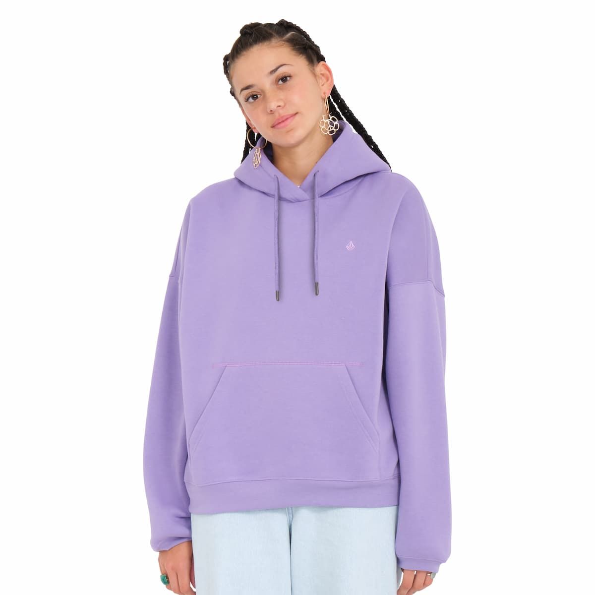Este cálido hoodie morado cuenta con corte muy amplio, capucha ajustable con cordón, hombros caídos, forro polar interior para mayor calidez, un bolsillo tipo canguro, bordado Stone en tono sobre tono en el lado izquierdo del pecho y bordado tonal Volcom en la capucha.