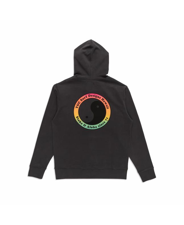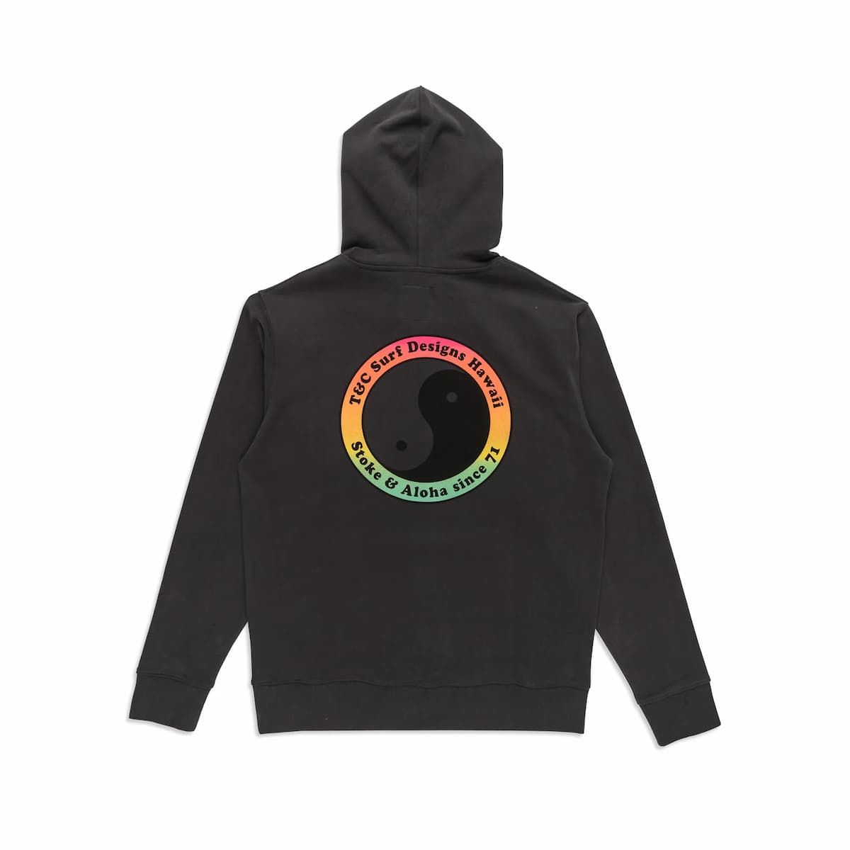 Este hoodie negro de corte clásico cuenta con capucha ajustable mediante cordón, un bolsillo delantero tipo canguro para mantener tus manos calientes o guardar tus objetos esenciales, el logo retro Yin Yang 71 de T&C impreso en el lado izquierdo del pecho y en la espalda, junto con la inscripción "T&C Surf Designs - Stoke & Aloha since 71" bordada en negro en la capucha.