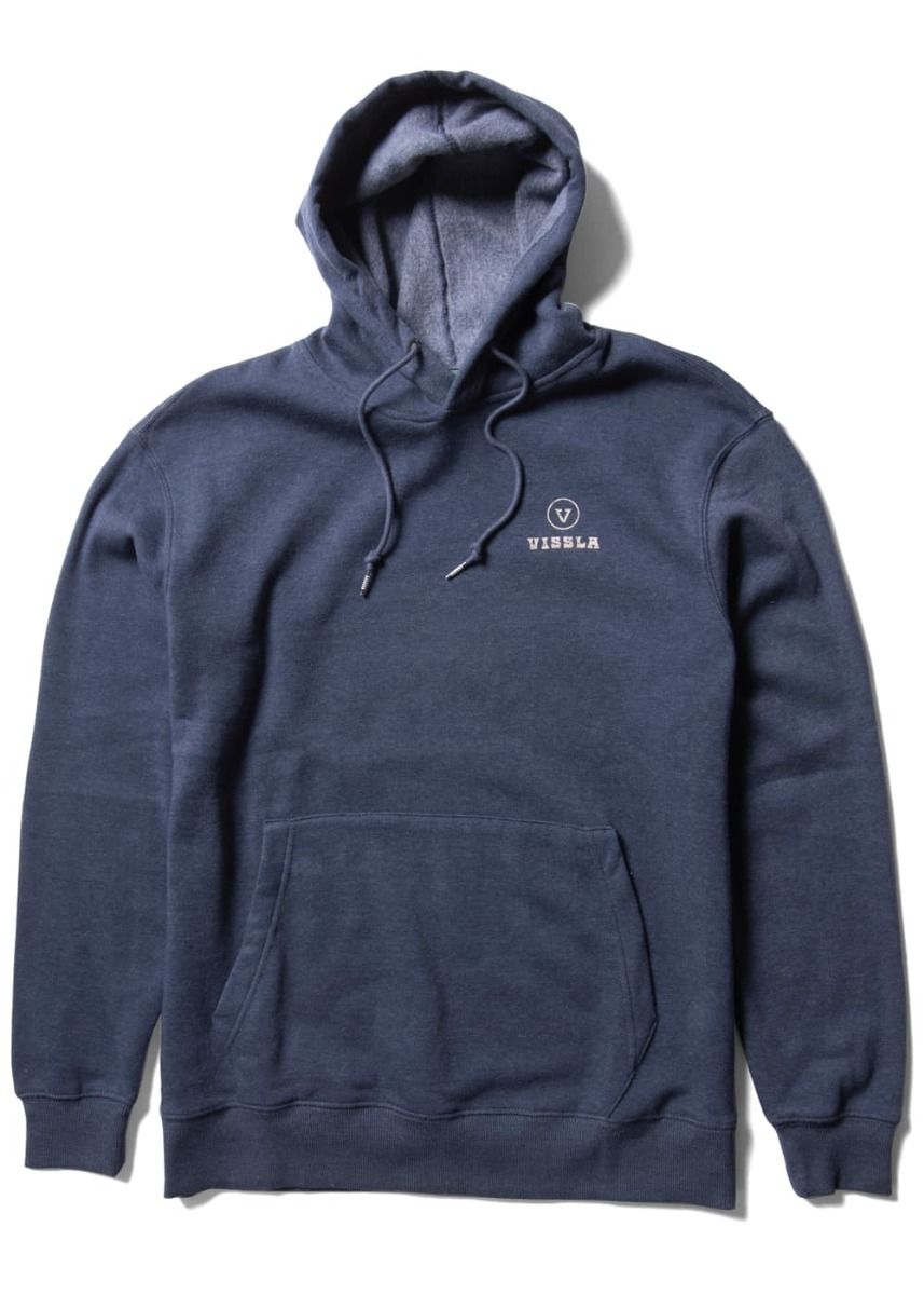 La sudadera con capucha para hombre Coastal Eco Pullover Hoodie en azul marino jaspeado (Midnight Heather) de Vissla está confeccionada con tejido de forro polar en mezcla de 60% algodón reciclado y 40% poliéster reciclado Repreve (280g).