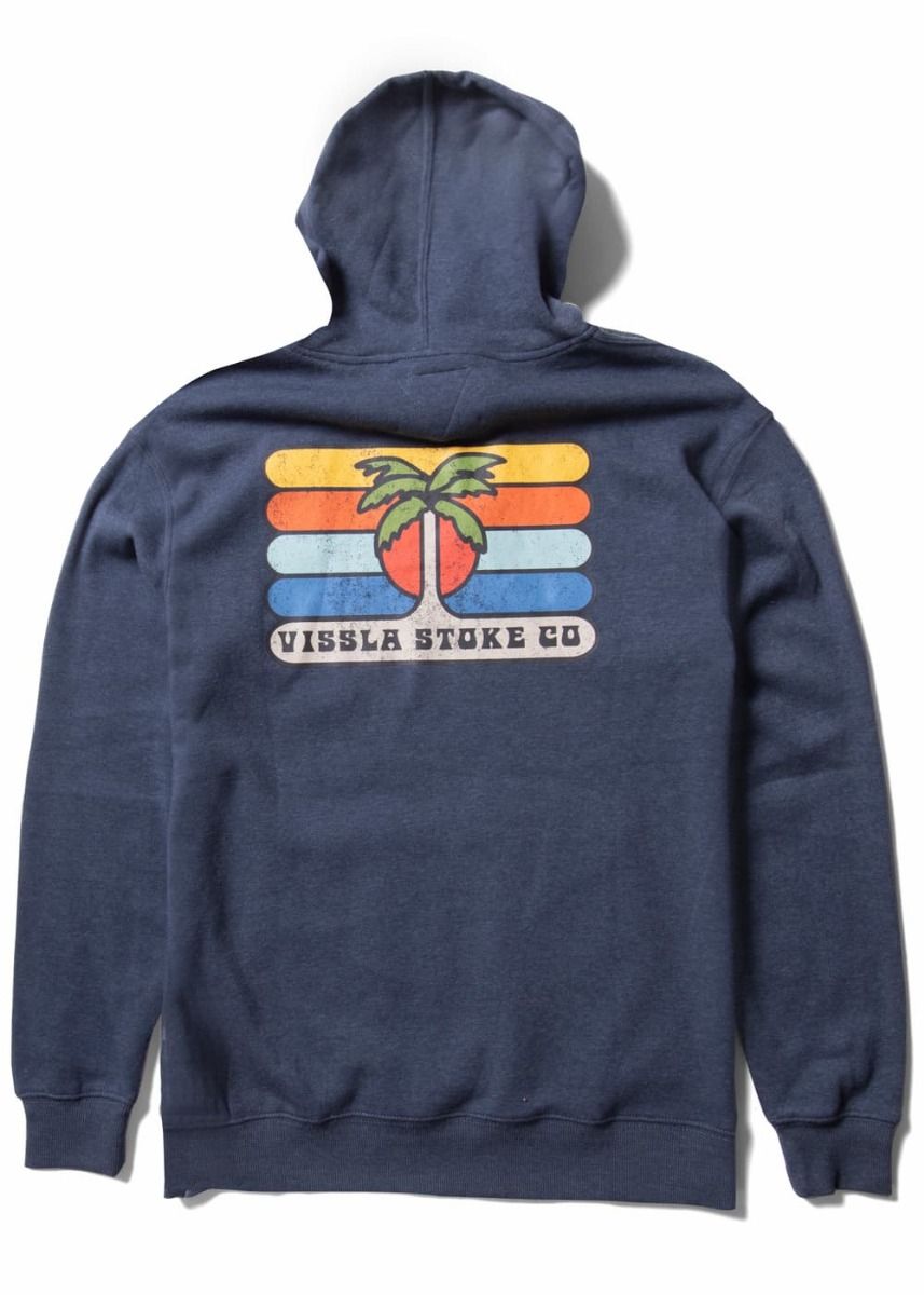 Este hoodie sostenible de corte clásico cuenta con forro polar, tejido lavado para un tacto suave, capucha ajustable mediante cordón, amplio bolsillo tipo canguro, el logo de Vissla serigrafiado en el lado izquierdo del pecho y un gráfico artístico de una palmera con la inscripción "Vissla Stoke Co." impresos en la espalda.