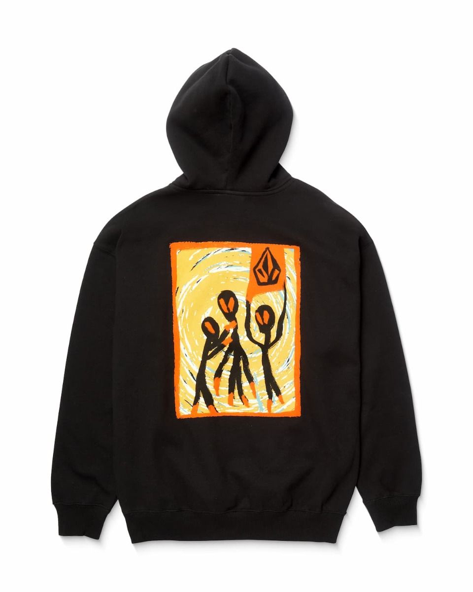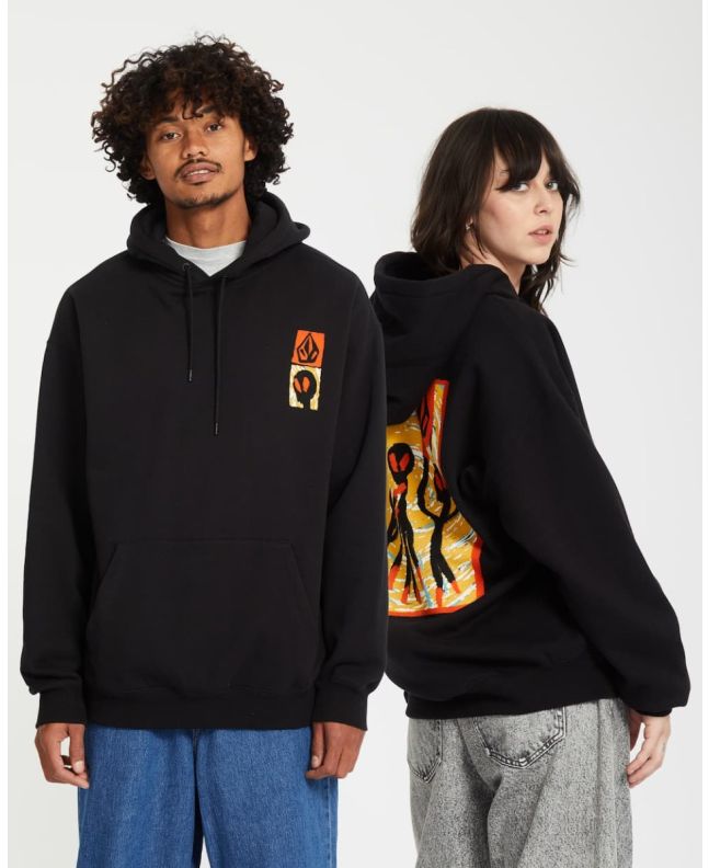 La Sudadera con Capucha para hombre y mujer Gonyvaders PO Negra (Black) de Volcom, fusiona arte, comodidad y sostenibilidad en una prenda única. Diseñada en colaboración con el surfista y miembro del equipo Volcom, Gony Zubizarreta, destaca por su exclusivo estampado gráfico en el pecho y la espalda, con un diseño de inspiración alienígena y el icónico logo de Volcom en tonos naranjas y amarillos sobre una base negra.