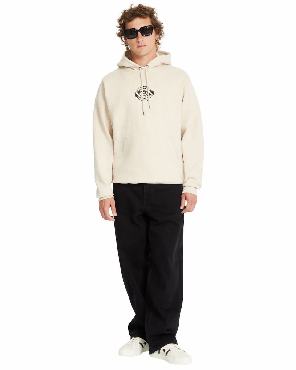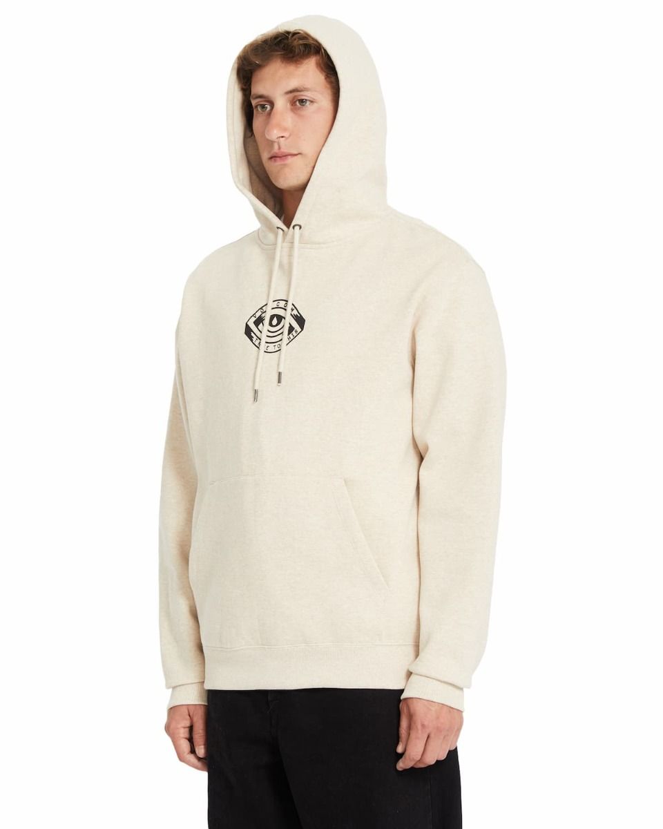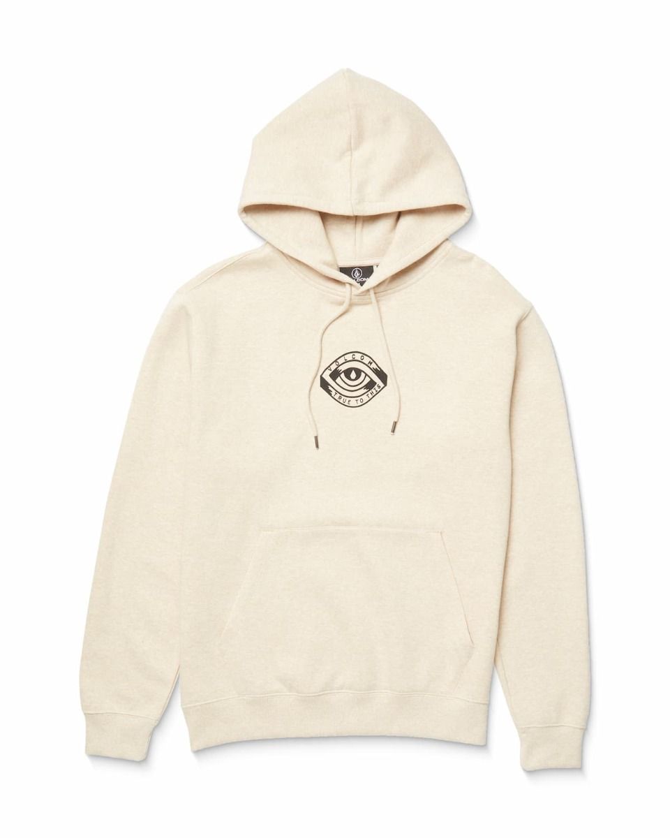 - Gráfico delantero: En la parte frontal, la sudadera presenta un estampado de un ojo dentro de un triángulo, con la frase "Volcom - True to This".