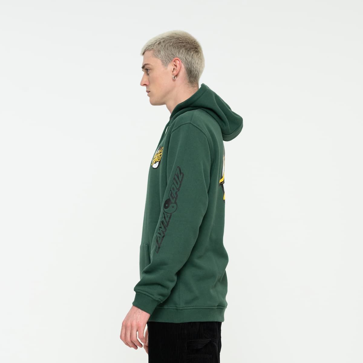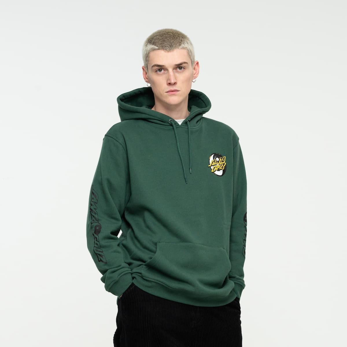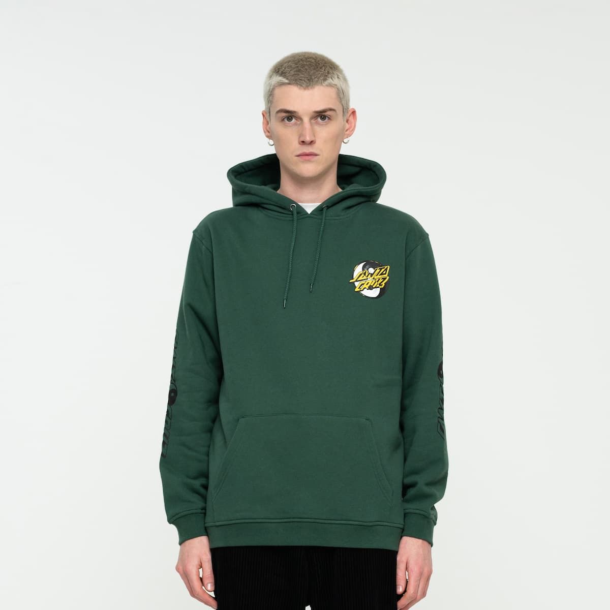 Este hoodie de ajuste regular cuenta con capucha ajustable mediante cordón, forro polar cepillado de 330 gsm, un amplio bolsillo tipo canguro y el logo de Santa Cruz junto con el símbolo del Yin Yang impresos en el lado izquierdo del pecho, en la espalda y en la manga izquierda.