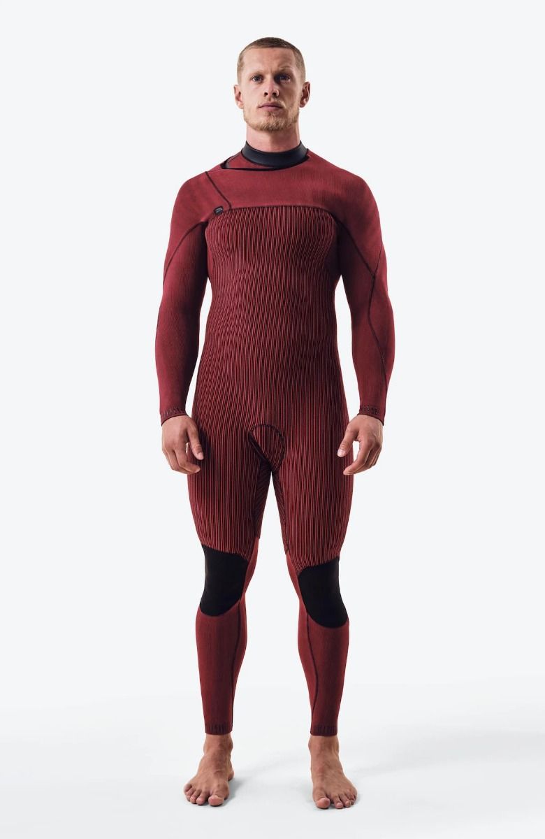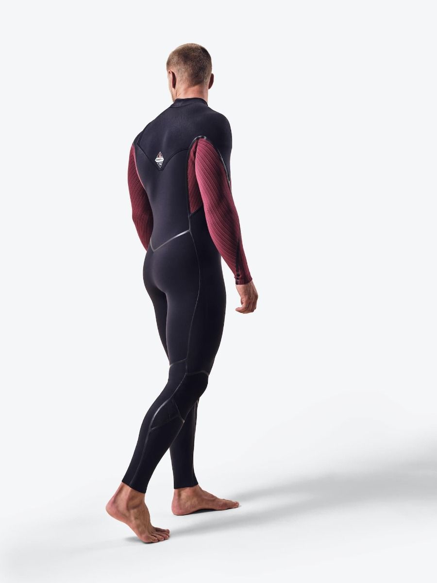 El traje de neopreno integral Hyperfreak Fire 4/3mm Plus Black-Dark Red para hombre cuenta con sistema de entrada con cremallera hermética en el pecho con tecnología FUZE, un extra de 0,5mm para calidez adicional, barrera antifugas, agujeros de drenaje, costuras GBS minimalistas, termoselladas con tape TB4X interior y con puntadas invisibles, que evitan la entrada de agua y ayudan a mantener una buena temperatura corporal, rodilleras Krypto y puños sellados en muñecas y tobillos.