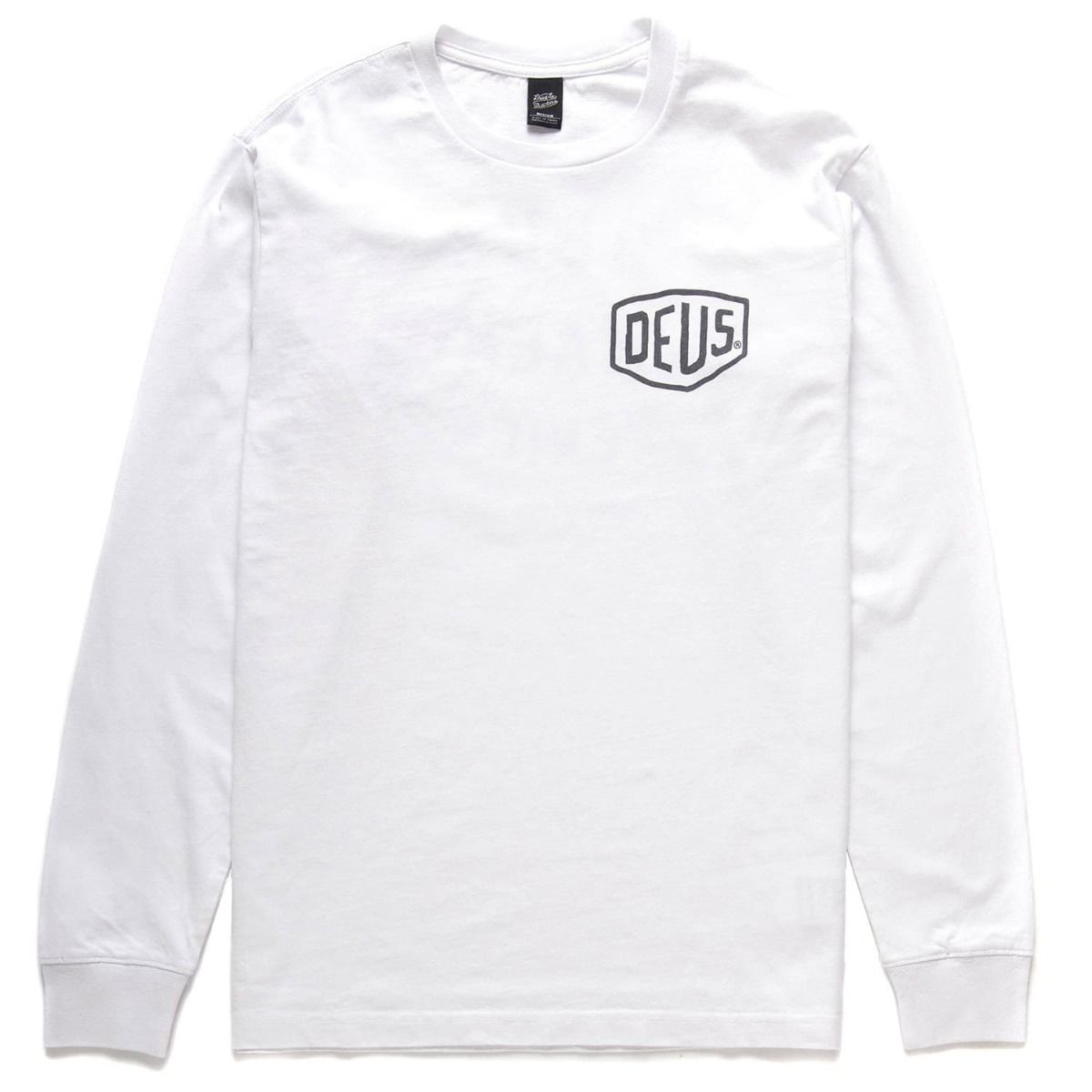 La camiseta Ibiza Address LS blanca tiene una etiqueta de garantía de Deus cosida en la manga izquierda.
